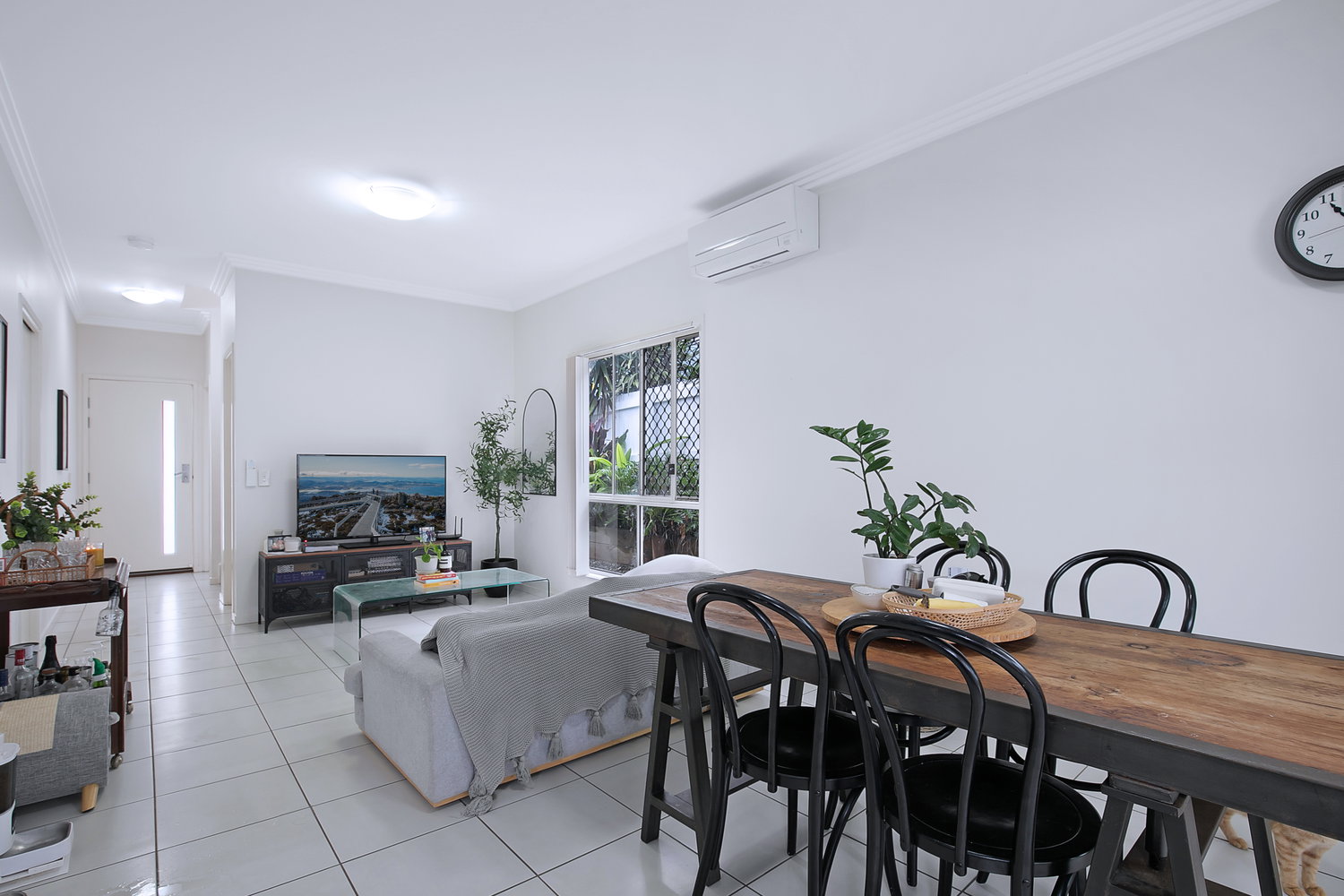 # Open plan living & dining with tiled flooring, air-conditioning and high ceilings