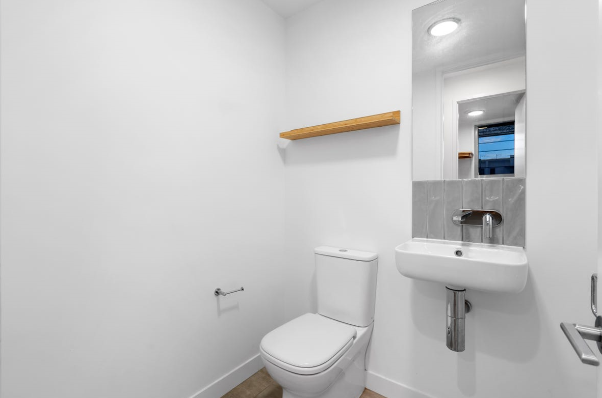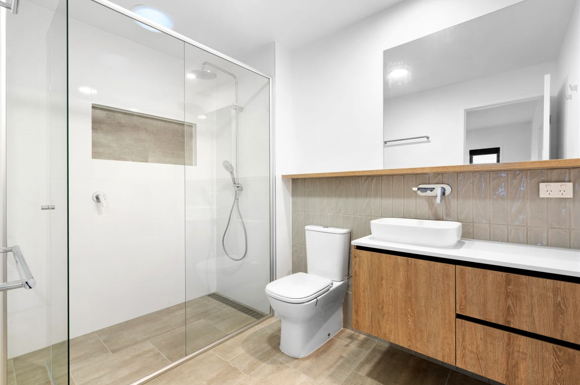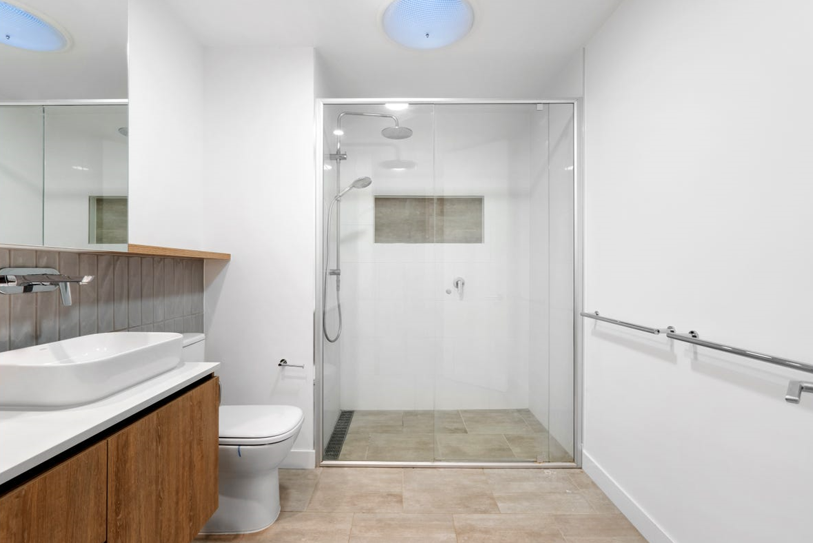 # Main bathroom with ample storage to vanity and large shower cavity.