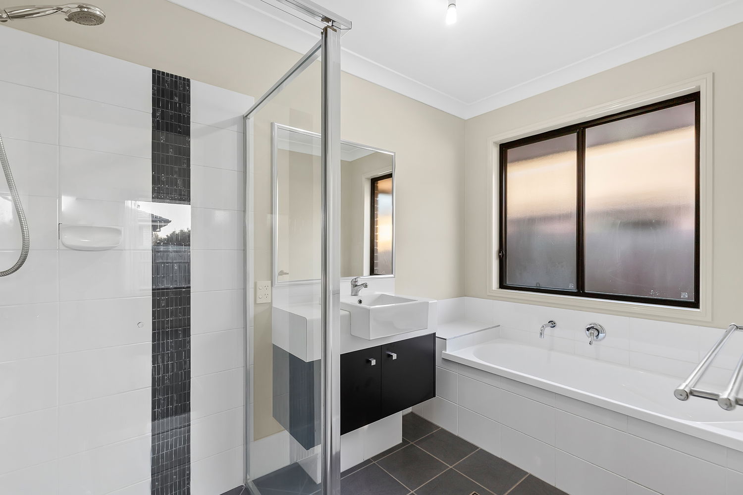 # A tasteful main bathroom with separate shower and bath allows easy living for the entire family.