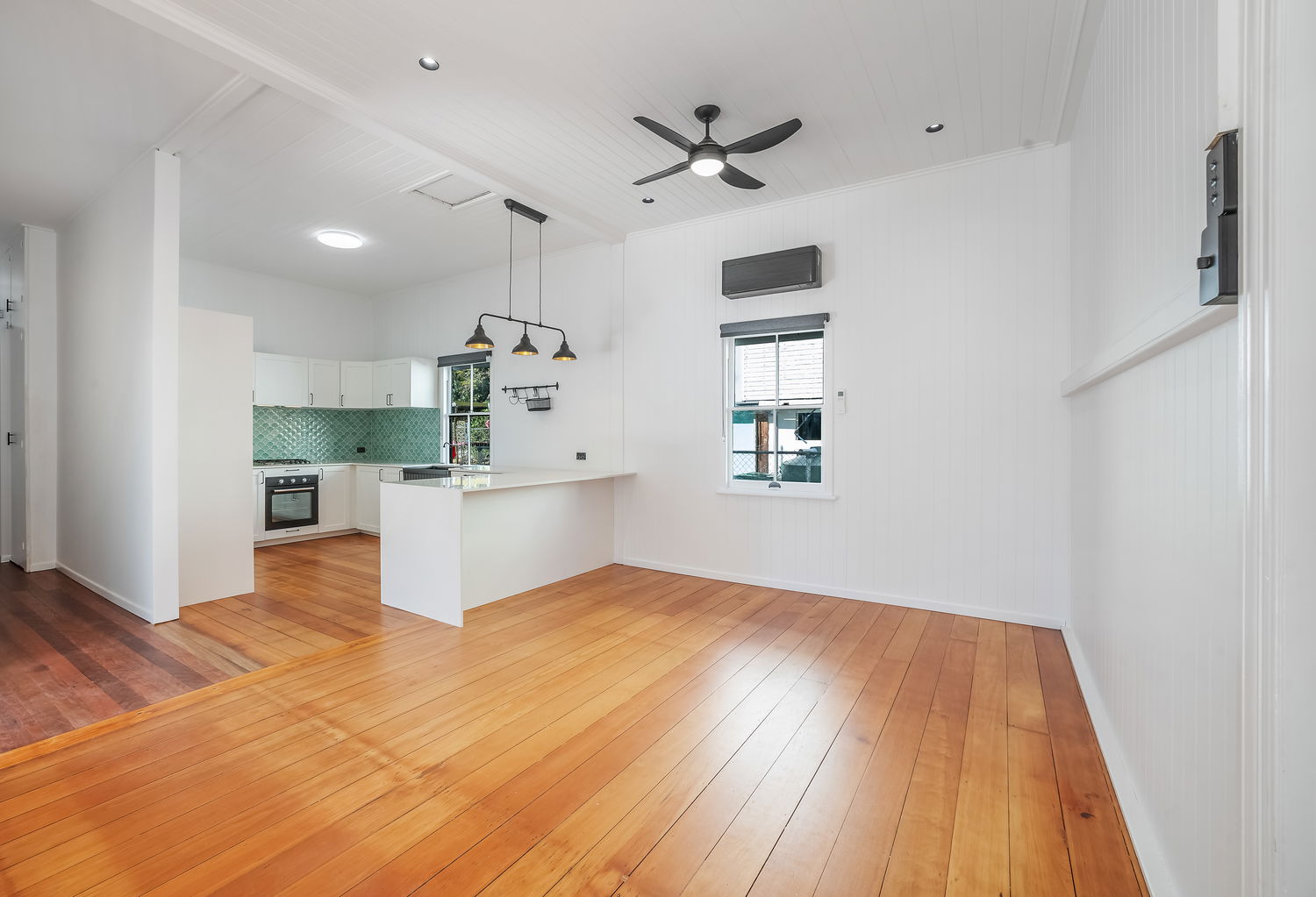 #Chef-style kitchen – sleek tiled splash back, ample cabinetry, pendant and downlight combo, breakfast bar, and fully fitted electrical appliances and gas cooktop ideal for host dining events and entertaining.