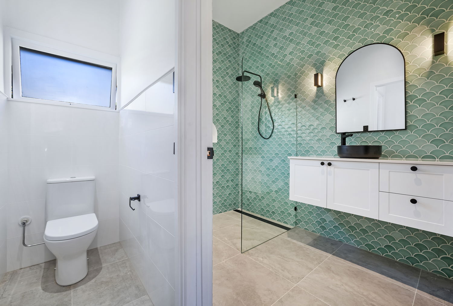 #Stylish modern bathroom – with floating vanity, open rainfall shower, emerald green tiled splash back, and a separate toilet for convenience.