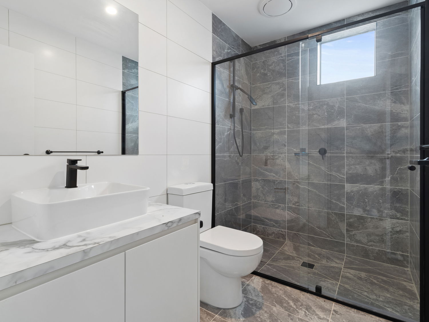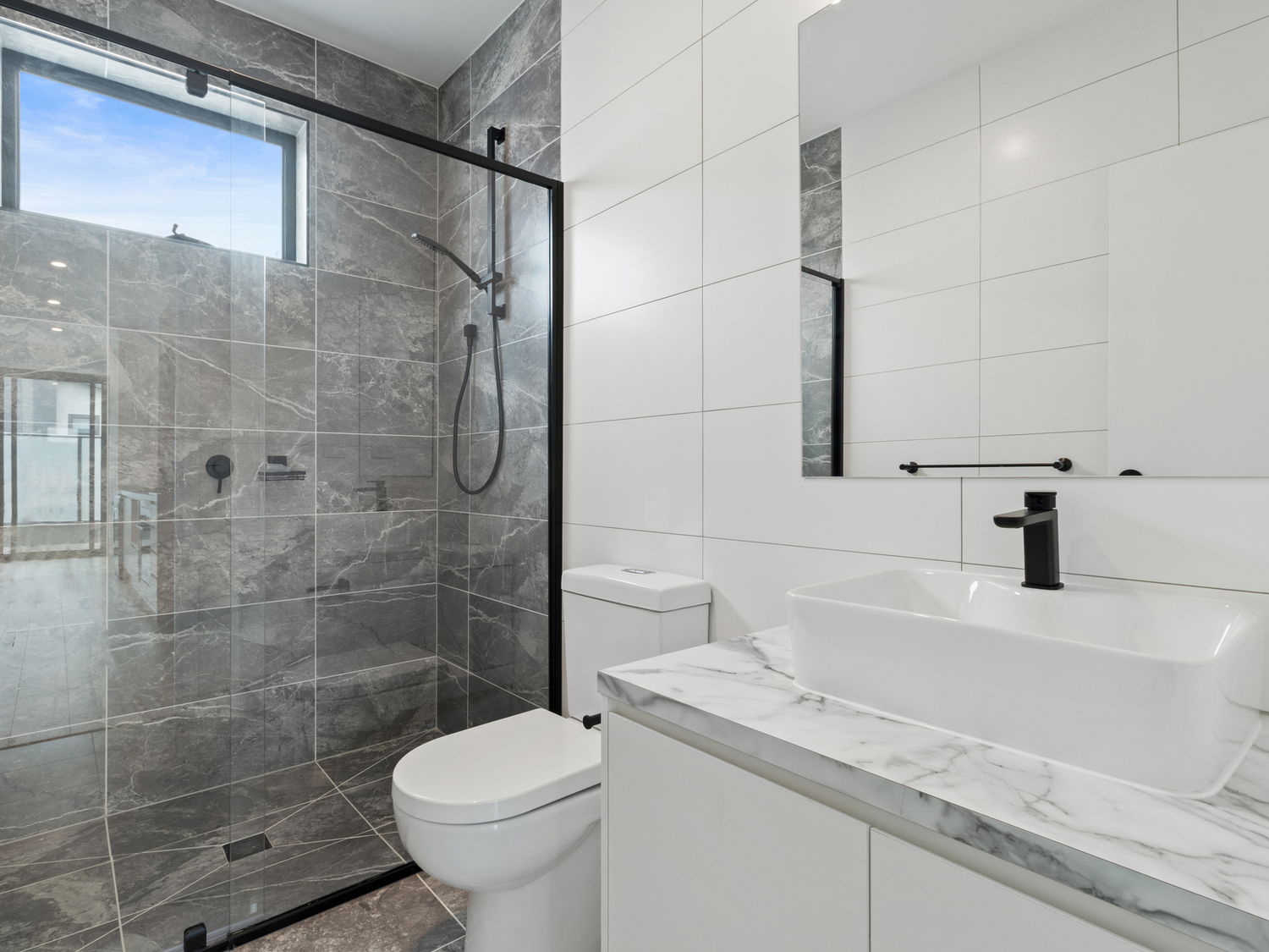 Two modern bathrooms with quality fittings and sleek matte-black shower screens