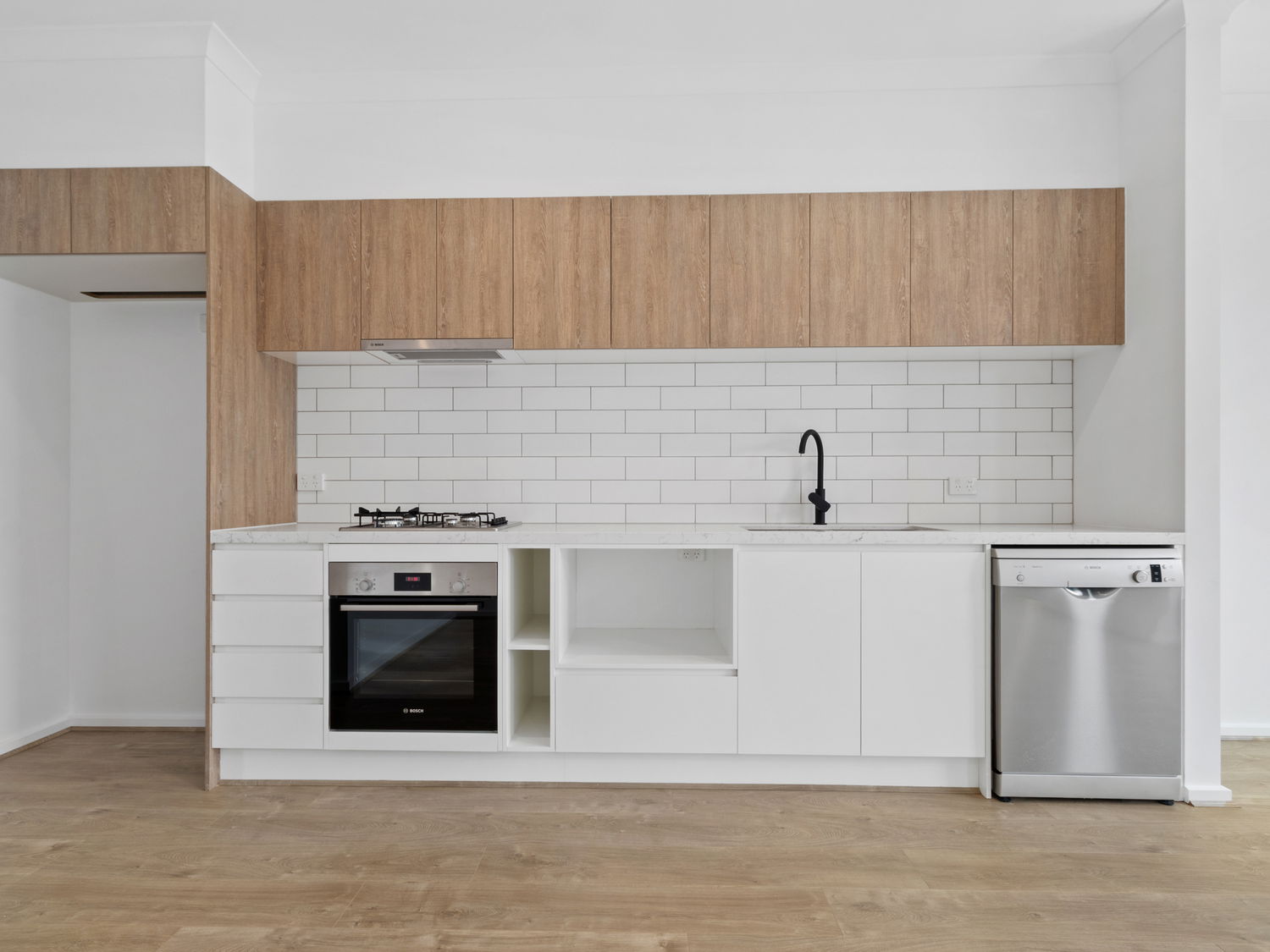 Timber-look laminate flooring in the kitchen, living, and dining areas