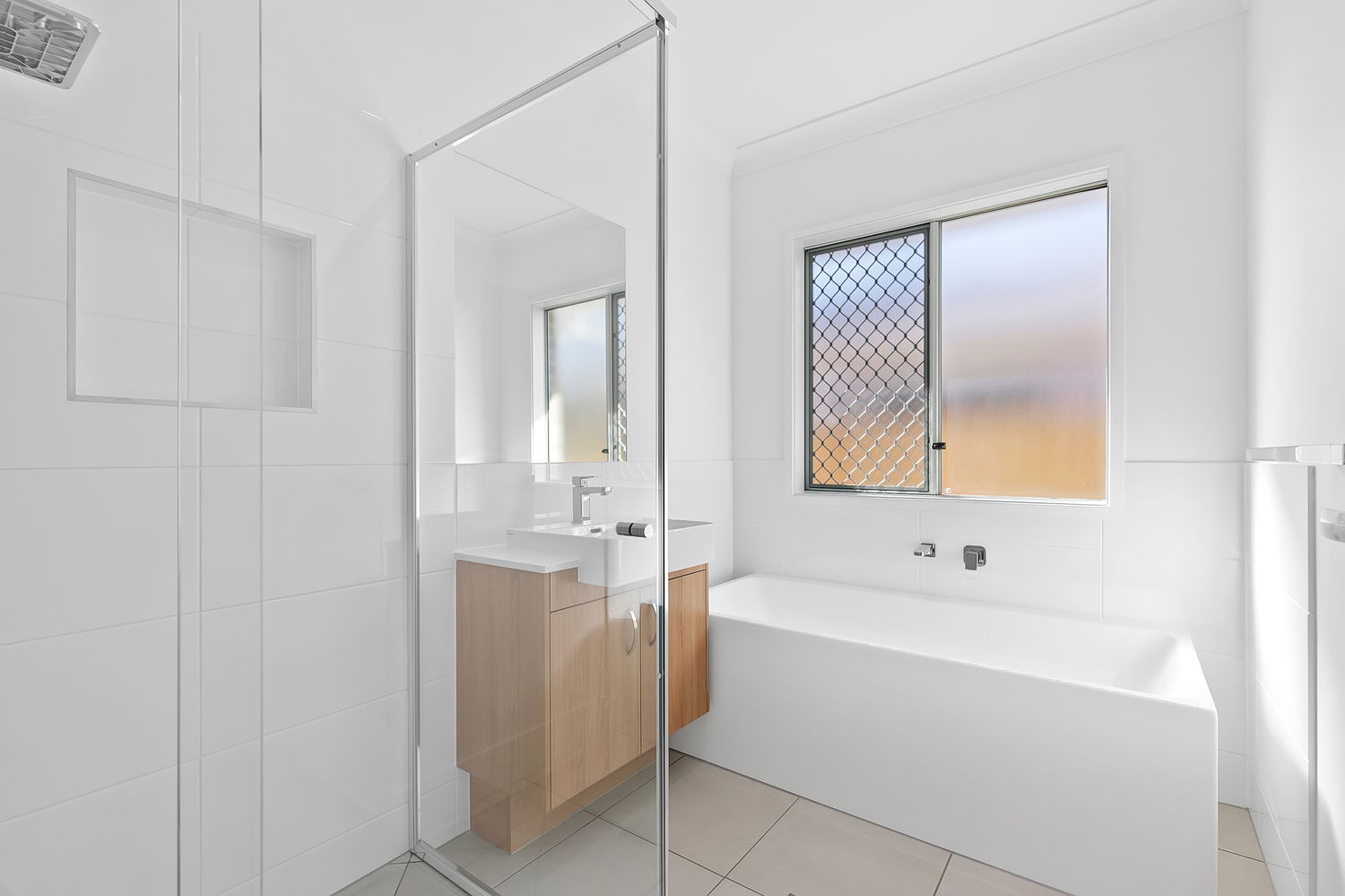 # Large main bathroom with ample storage to vanity, large shower cavity, and separate bathtub.