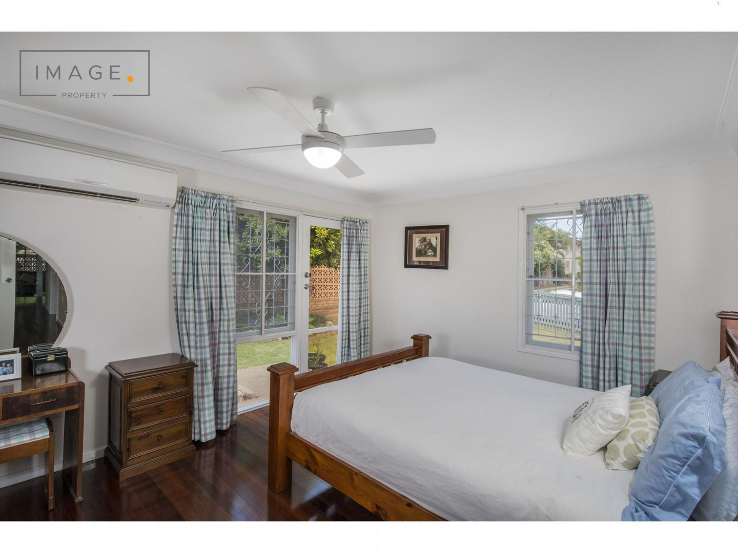 # Master bedroom with SPLIT SYSTEM AIR CONDITIONING & ceiling fan. Access to the backyard via lockable door.