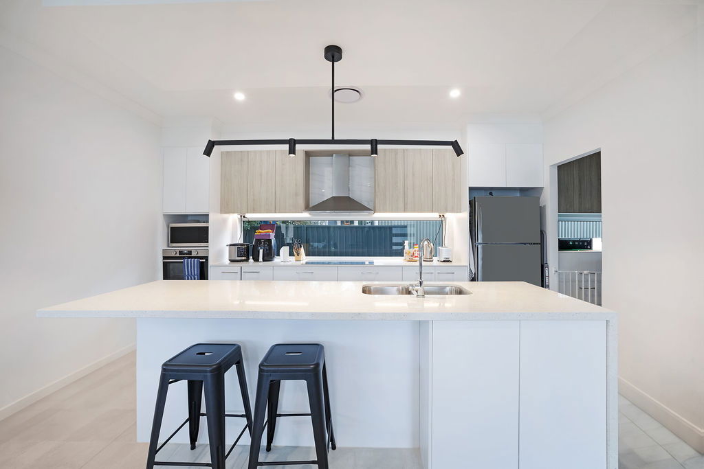 # Bright and modern kitchen with upgrades throughout! Electric cooking, dishwasher, stone bench tops, waterfall island bench with breakfast bar, walk in pantry and plenty of cupboard space.