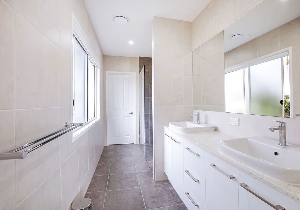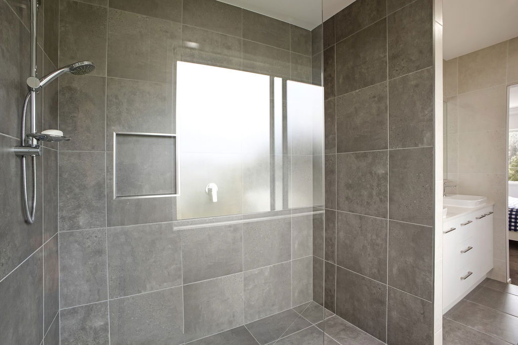 # En-suite features floor to ceiling tiles, huge shower, double basins and plenty of storage to vanity.