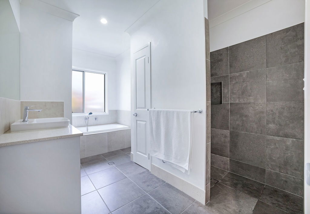 # Main bathroom on the upper level with large shower cavity with recess, bath tub and plenty of storage to vanity and laundry chute.