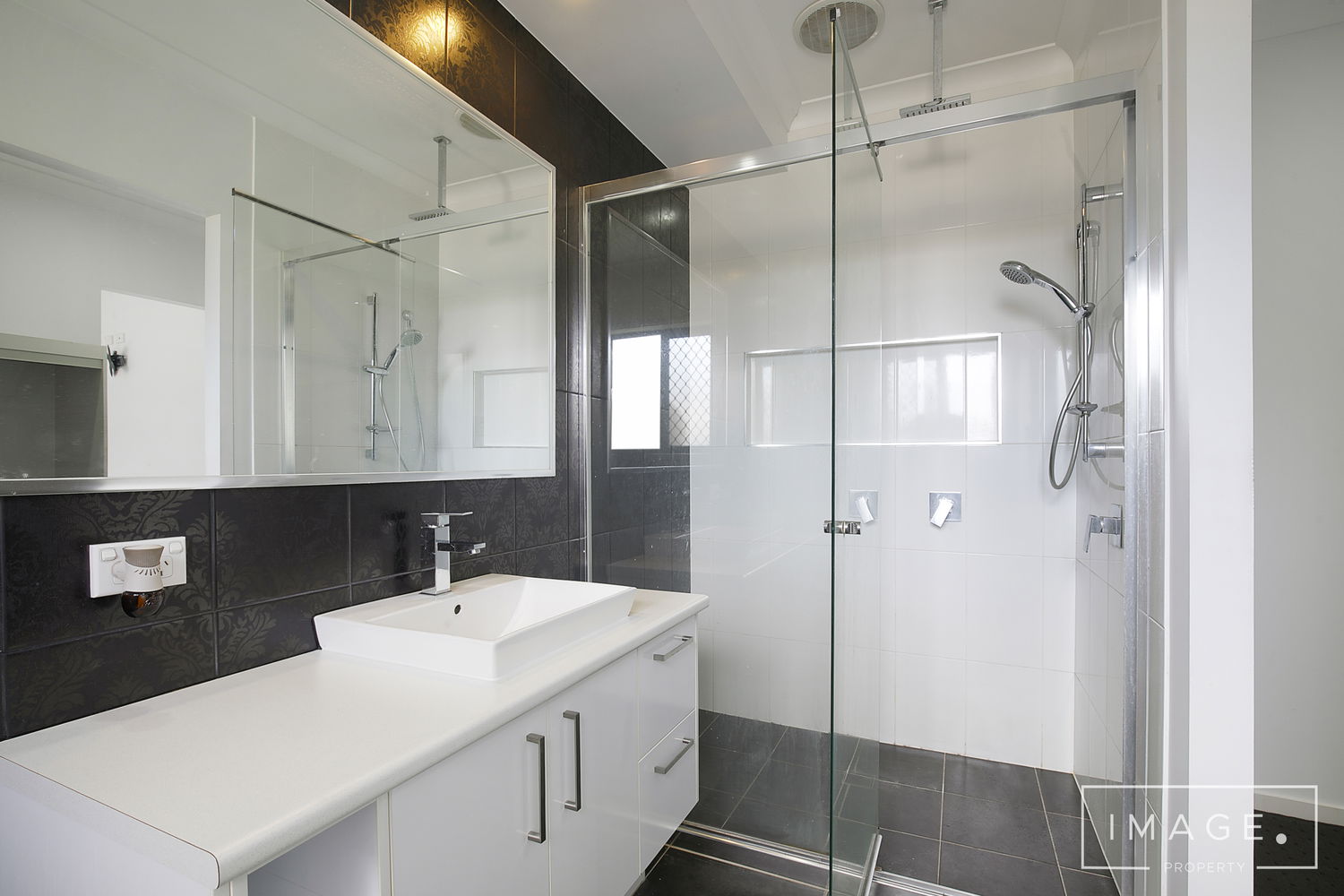 # Main bathroom has large shower recess, ample storage to vanity and toilet.