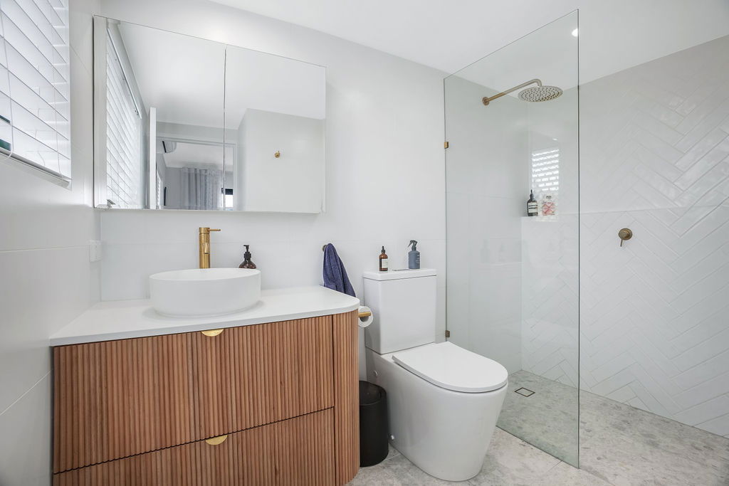 # Stunning main bathroom with large shower, toilet and storage to vanity.