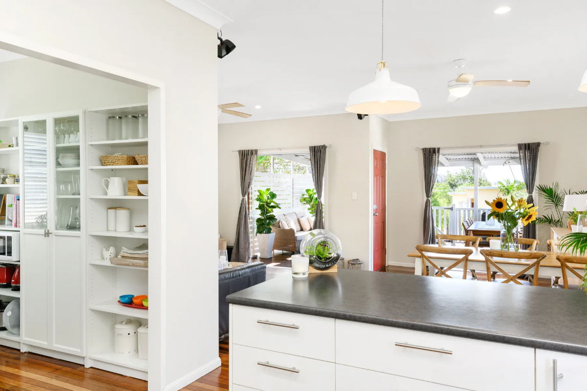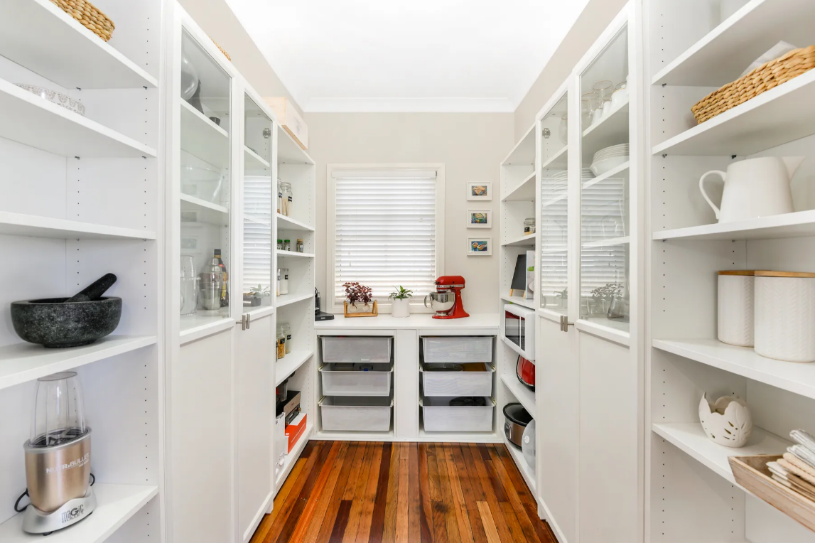 # Modern kitchen with appliances inclusive of dishwasher, oven, cooktop and rangehood. Kitchen features an oversized walk in pantry, perfect for storage.