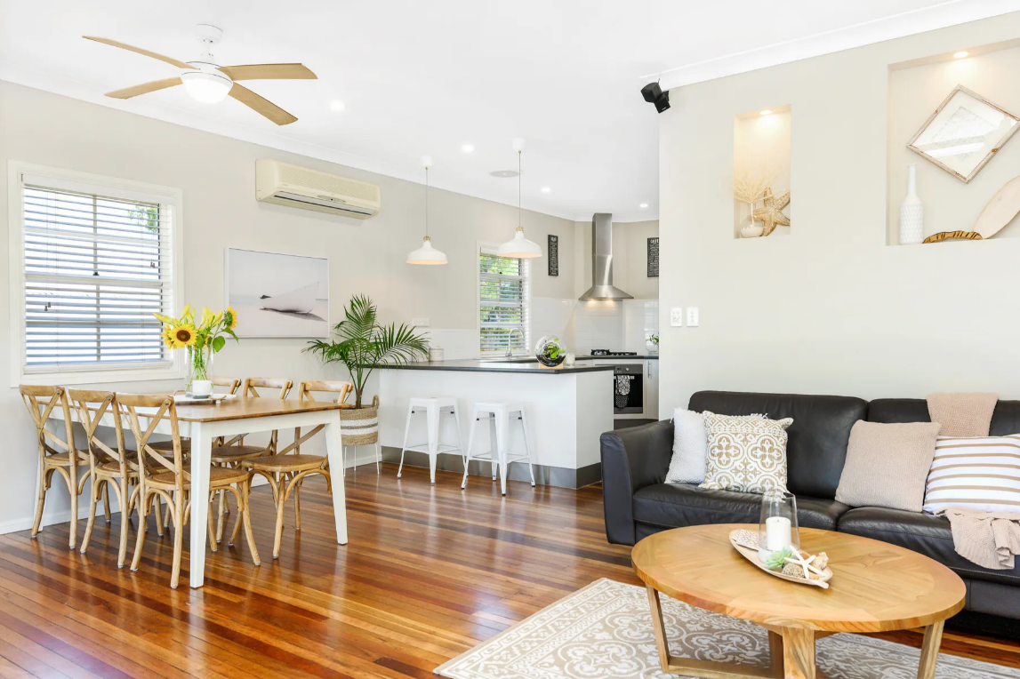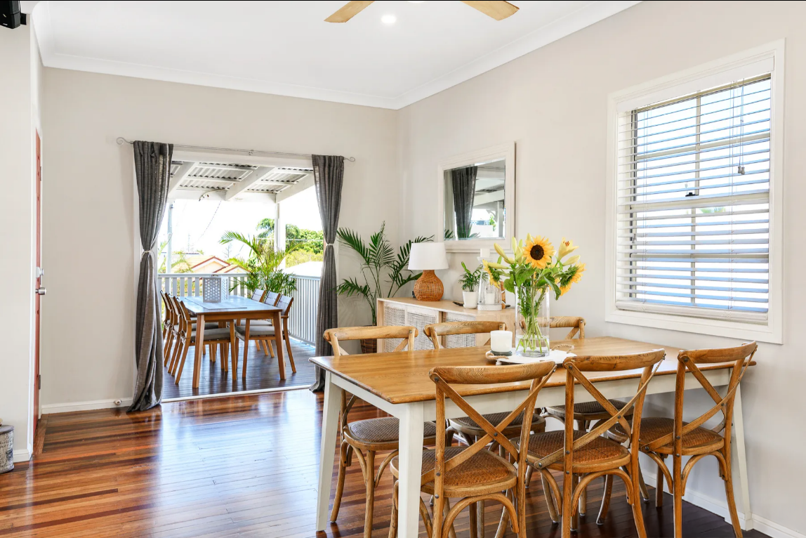 # Open-plan living and dining upstairs opening out to the expansive deck with bay breezes.