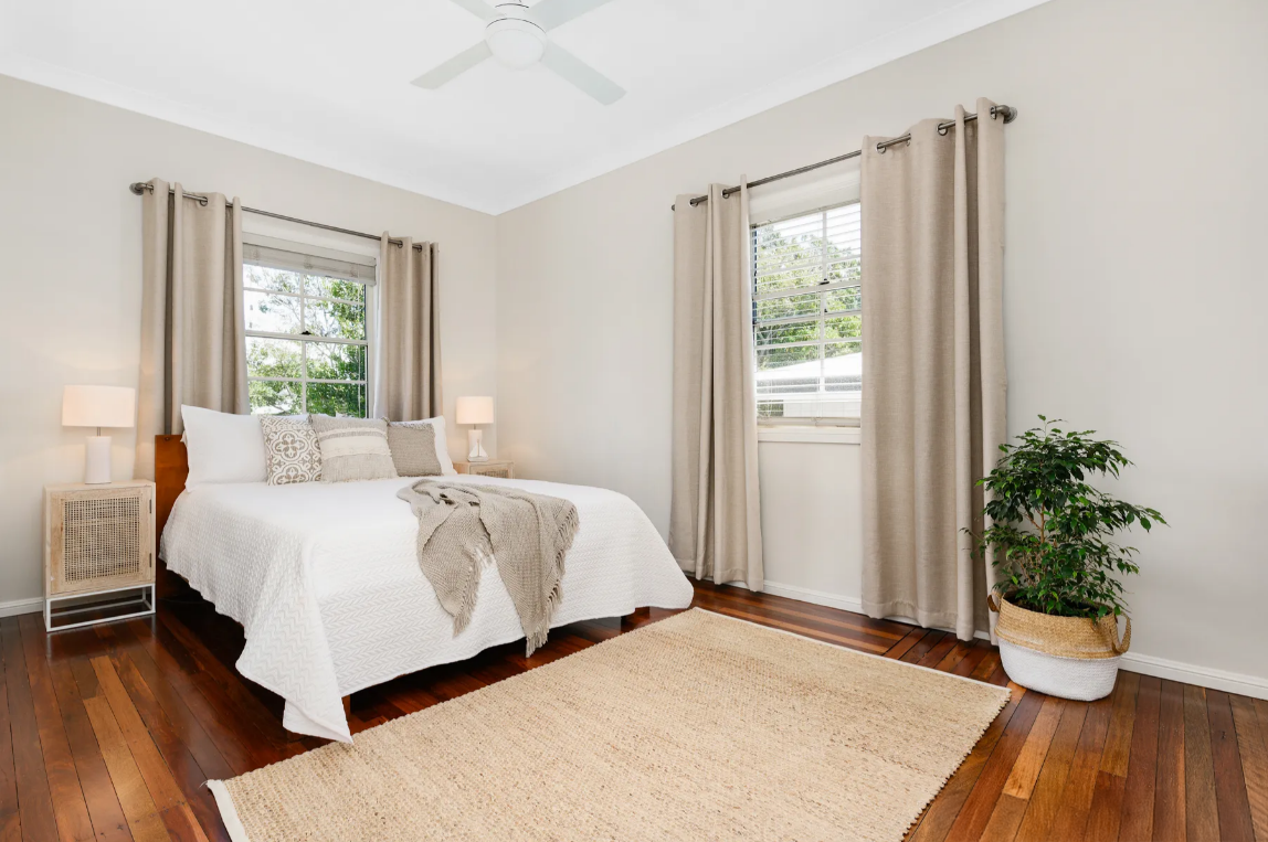 # Master bedroom with air conditioning, access to the upstairs bathroom, ceiling fan and spacious walk-in wardrobe.