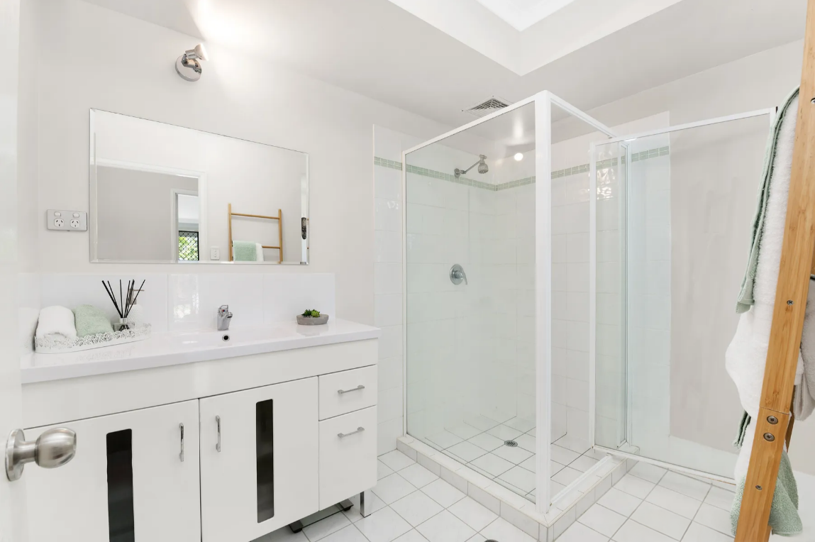 # Downstairs bathroom with ample storage to vanity, large shower and toilet