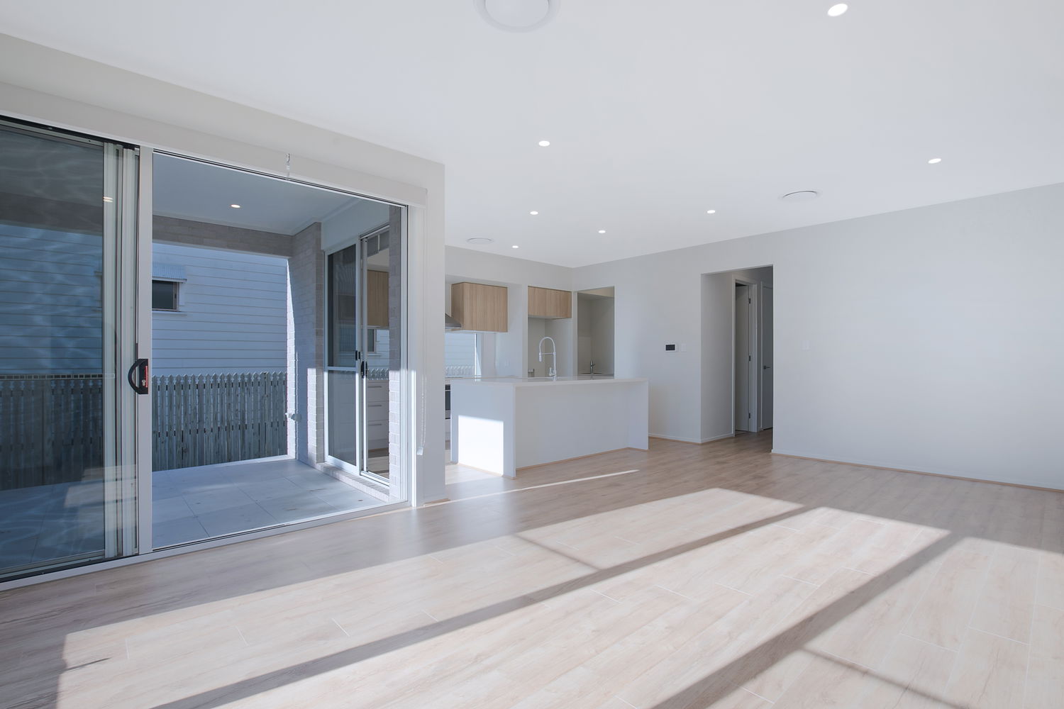 # Open plan living and dining with timber style flooring and ducted air-conditioning. Sliding doors leading onto an outdoor area.