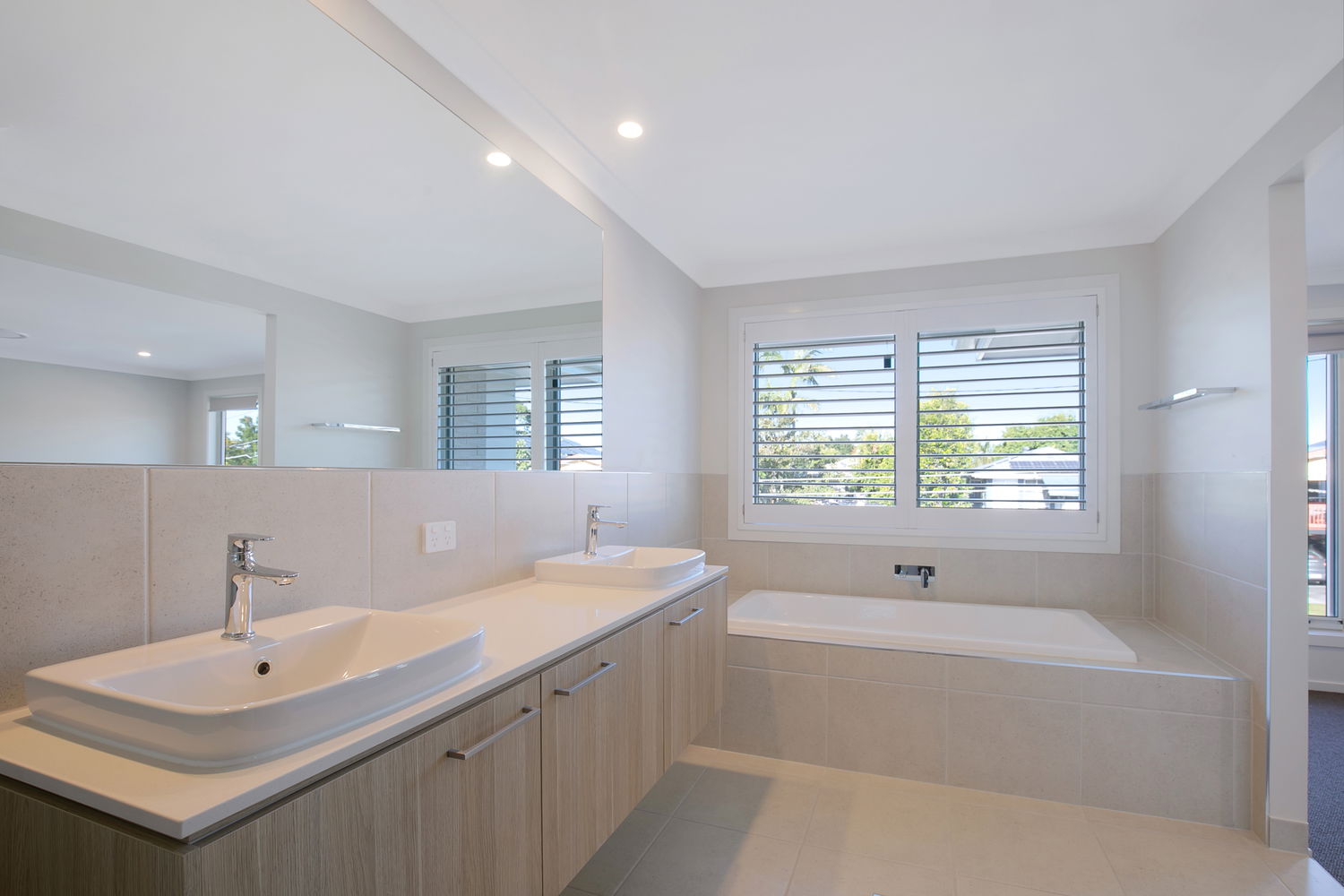 # Private ensuite with double sink basins, large shower with rainfall shower head, separate bathtub, ample storage to vanity. Separate toilet