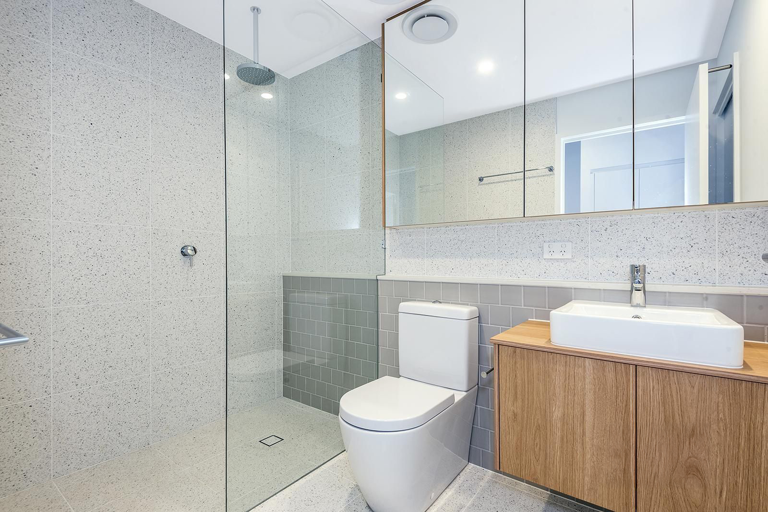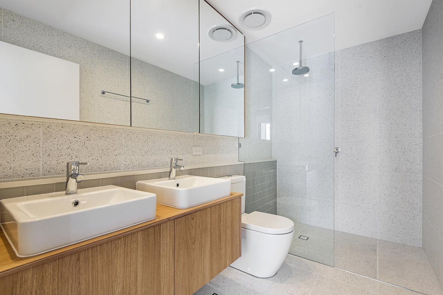 # Both stunning bathrooms contain wall to wall showers and stunning contemporary fixtures. The floor to ceiling Italian tiles throughout provide an elegant background to the functional cabinetry and ceramic fixtures.