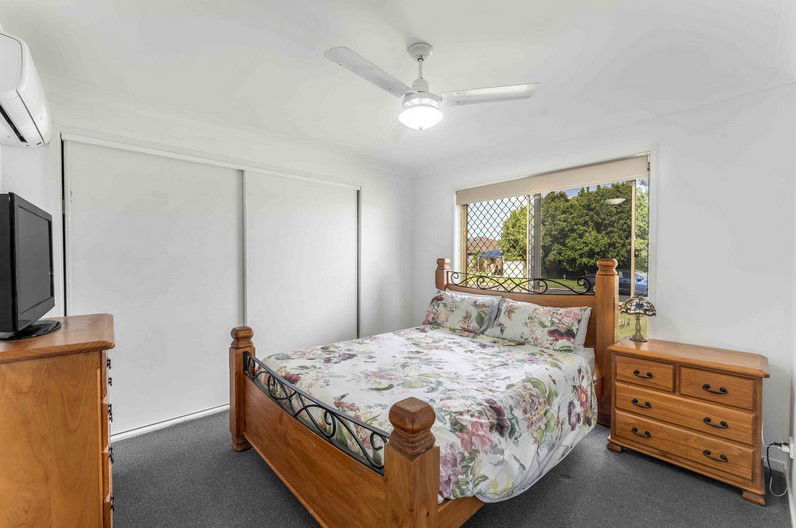# Main bedroom with split system air-conditioning, ceiling fan and built in wardrobe