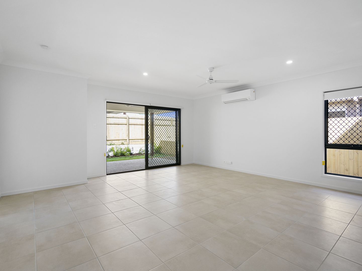 # LARGE Open plan tiled living and dining with AIR CONDITIONING and ceiling fan opening to large covered entertaining area