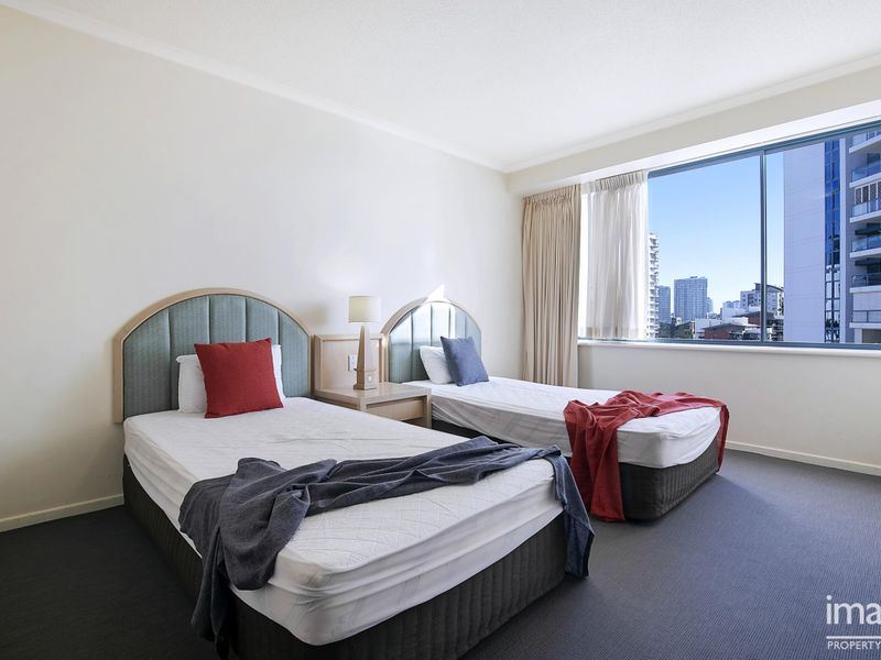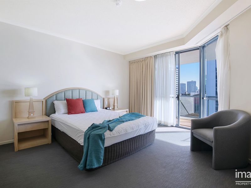 The King-sized master bedroom features built-in robes, a private ensuite, and direct balcony access, while the second large bedroom also includes built-in storage and double beds, providing ample space for family or guests.