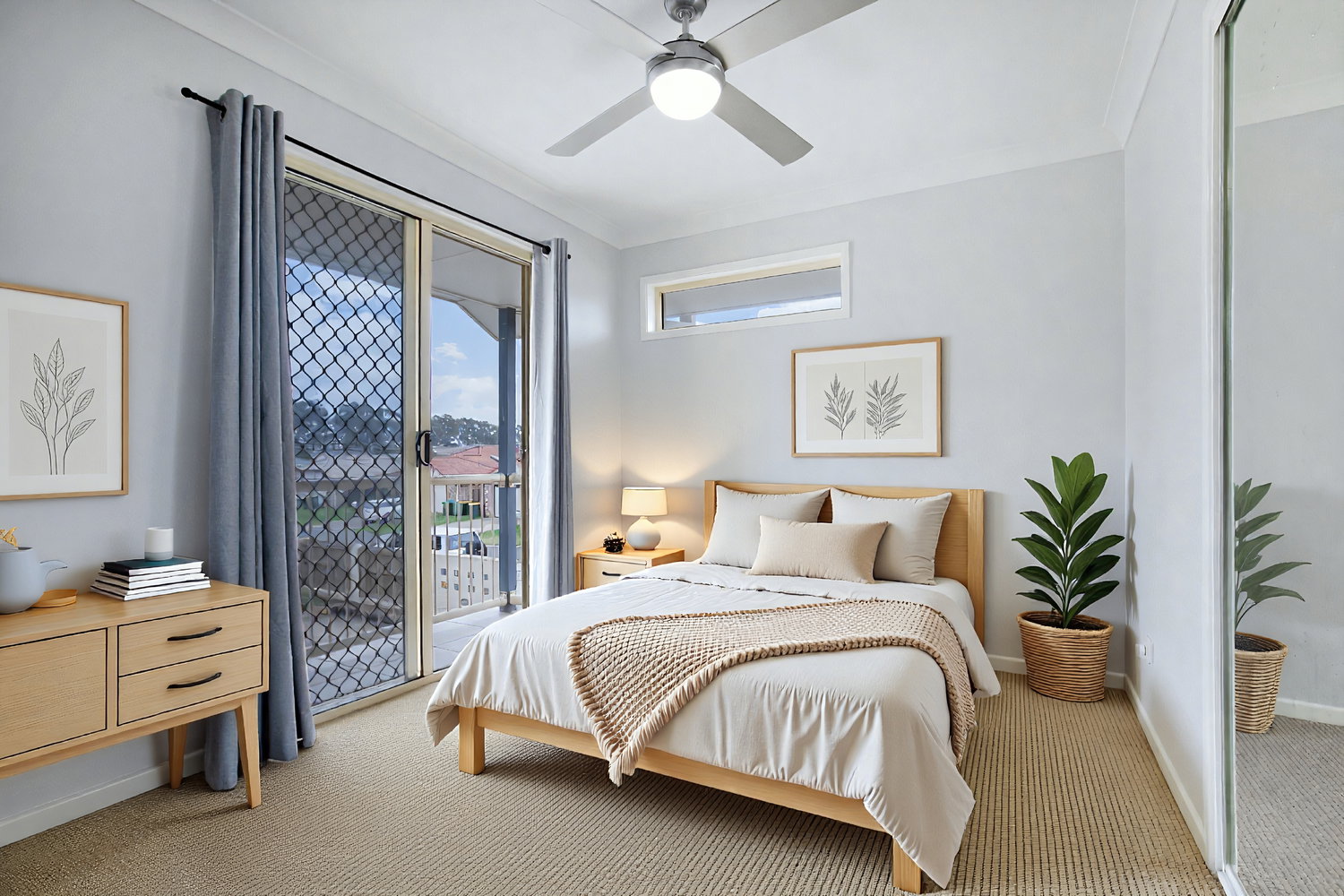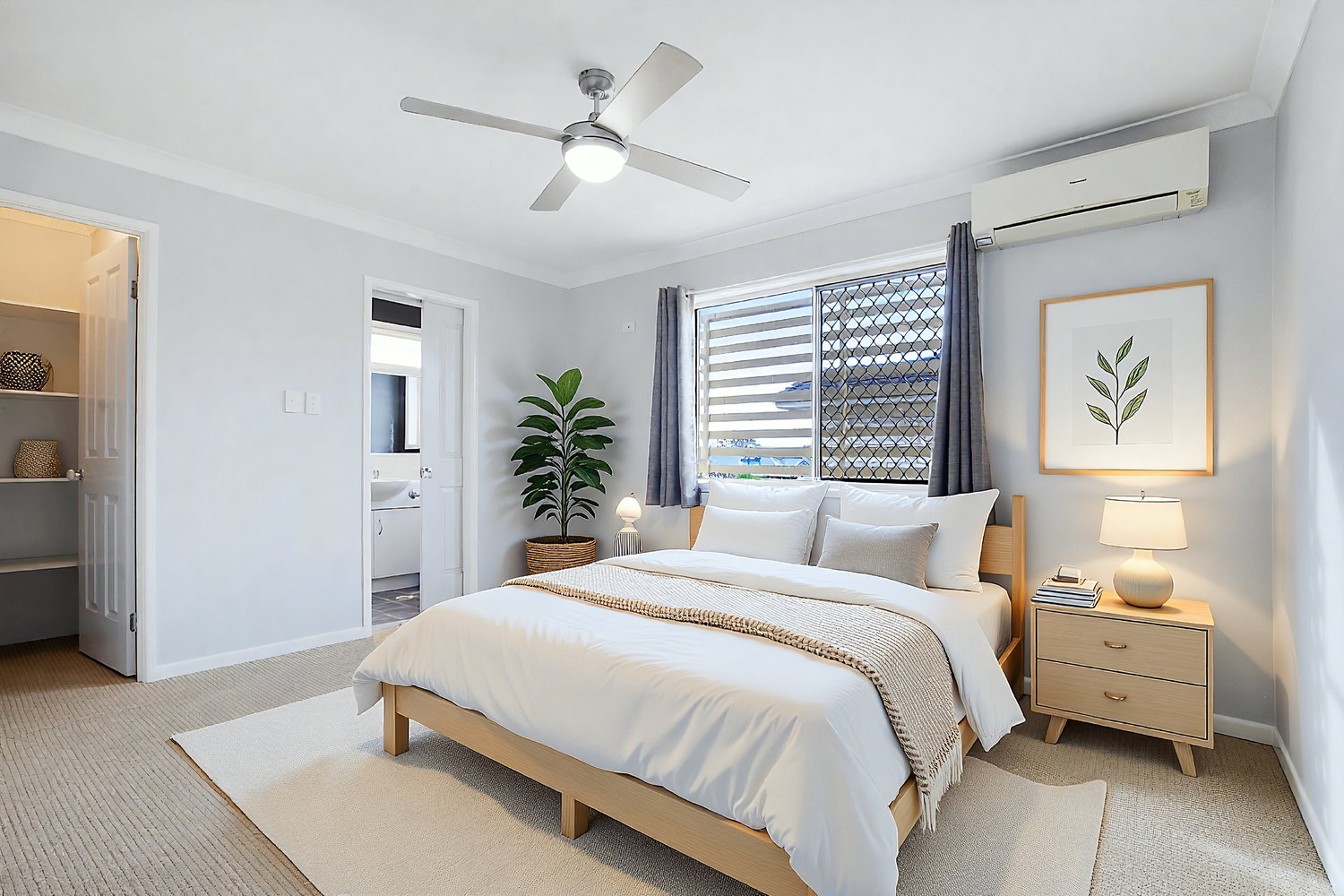 Upstairs, the home continues to impress with three well-appointed bedrooms. The master bedroom boasts its own private en suite, a split-system air conditioner, and a walk-in wardrobe, while the remaining bedrooms are complete with ceiling fans and built-in wardrobes, ensuring comfort and functionality for the whole household.
