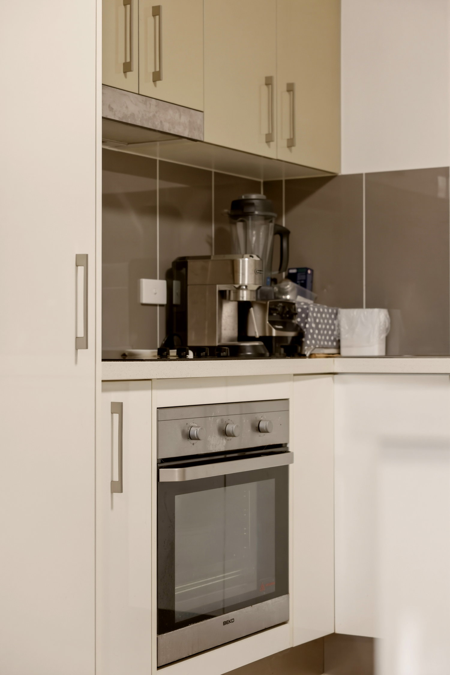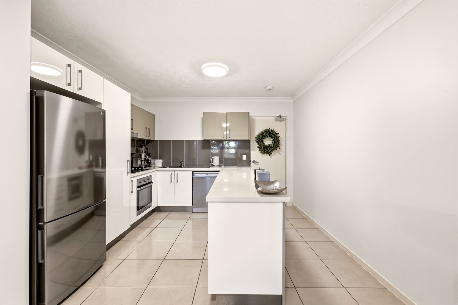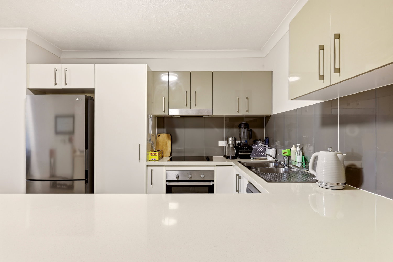 * Stylish kitchen with stone benchtops and stainless steel appliances