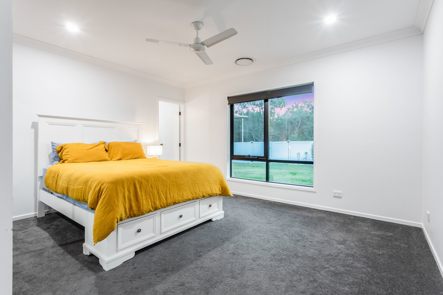Throughout the home, ducted air-conditioning, LED lighting, and ceiling fans ensure year-round comfort, while thoughtful inclusions such as a large walk-in linen cupboard and separate oversized laundry add practicality to the design.