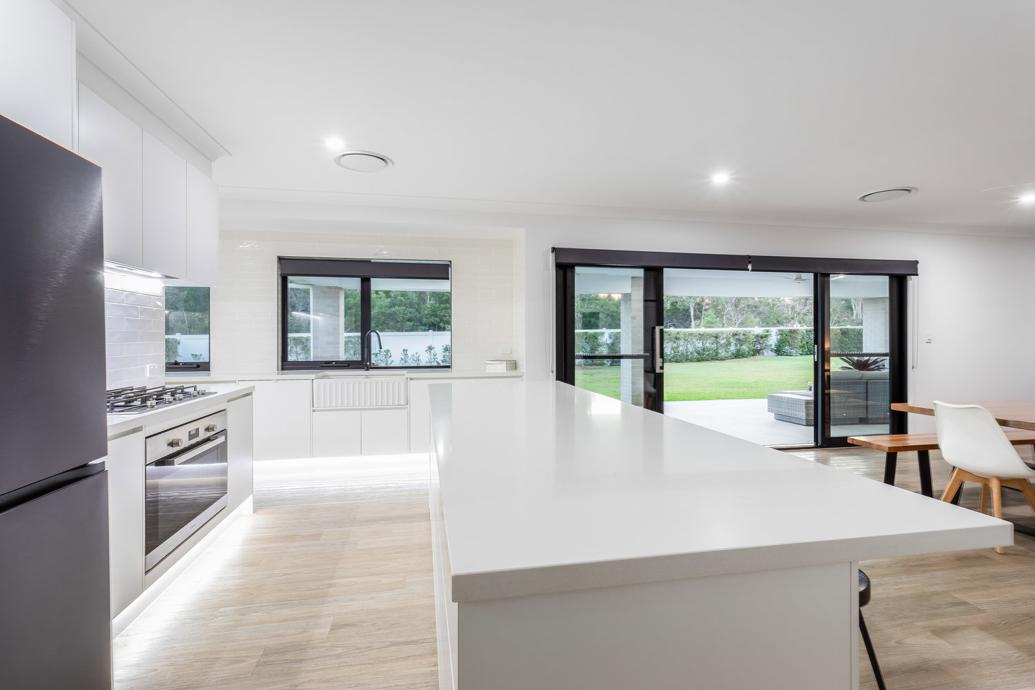 At the centre, the kitchen is nothing short of exceptional. Featuring 40mm stone benchtops, stainless steel appliances, a gas cooktop, undermount sink, and a spacious walk-in pantry. It’s a space that balances functionality with high-end design. The oversized dining and living areas flow seamlessly from here, connecting directly to the outdoor entertaining space.
