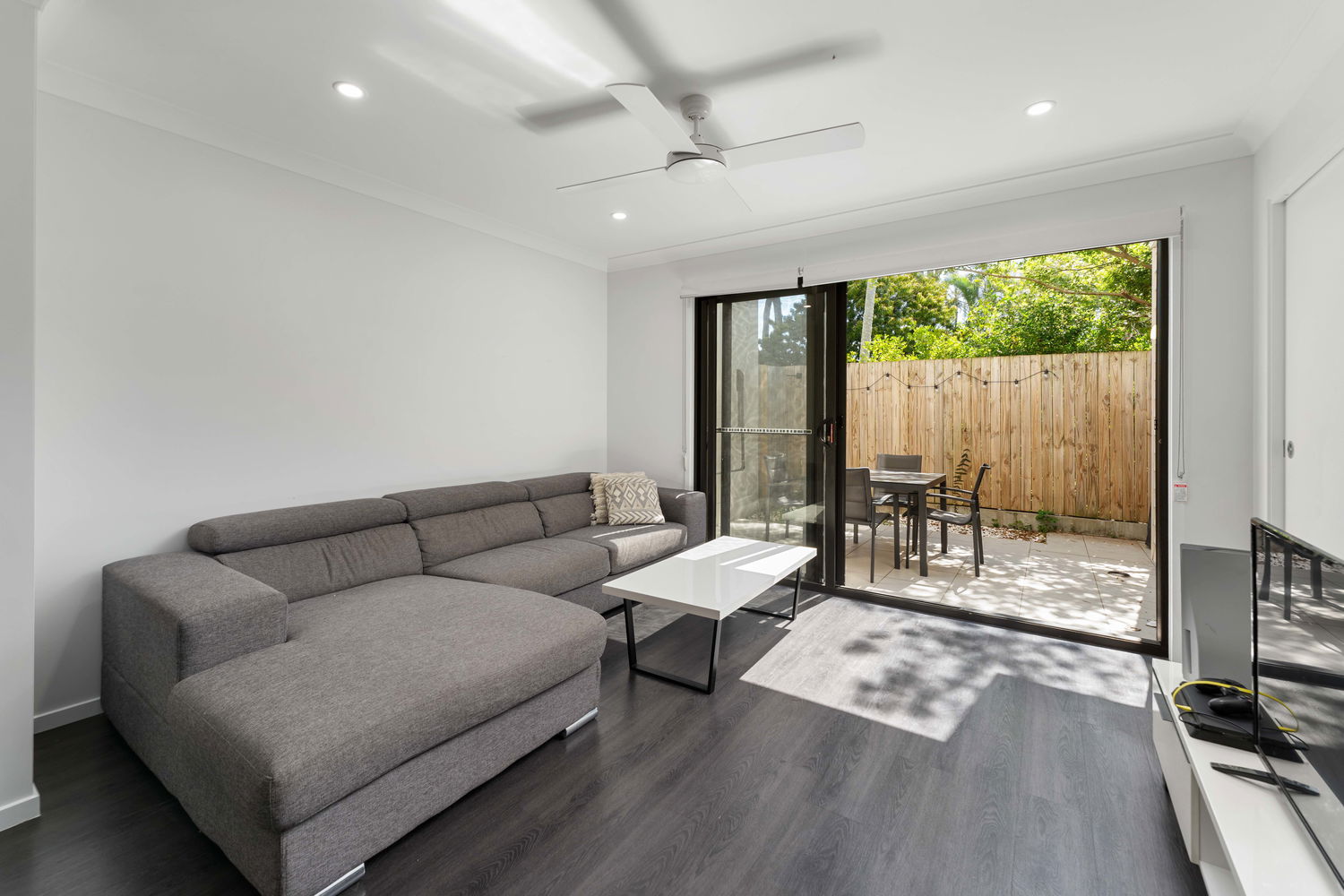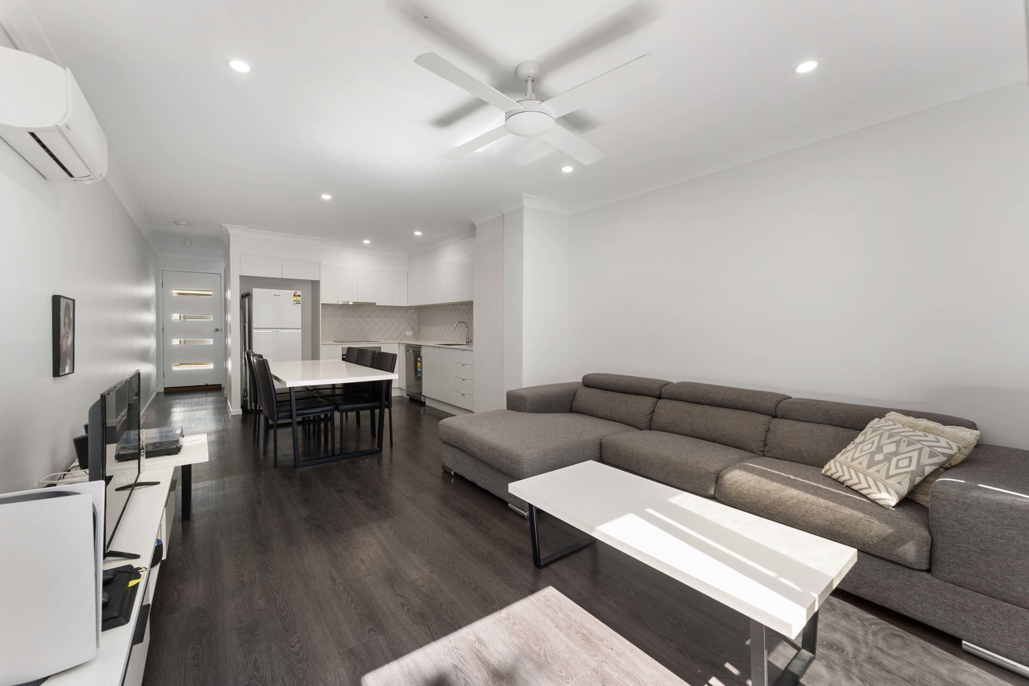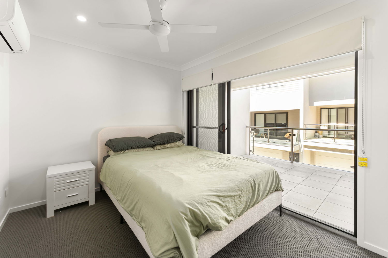 Inside this 2019-built townhouse, you’ll find an air-conditioned open plan living and dining area flowing out to a private courtyard, ideal for relaxing or entertaining. The modern kitchen is finished with stone benchtops and a sleek, functional design. Downstairs also includes a double-length lock-up garage with room for two cars — a rare bonus for townhouse living. Upstairs, the master bedroom includes air conditioning, an ensuite with stone benchtops, and direct access to the balcony. Ceiling fans feature throughout, ensuring year-round comfort in every room.