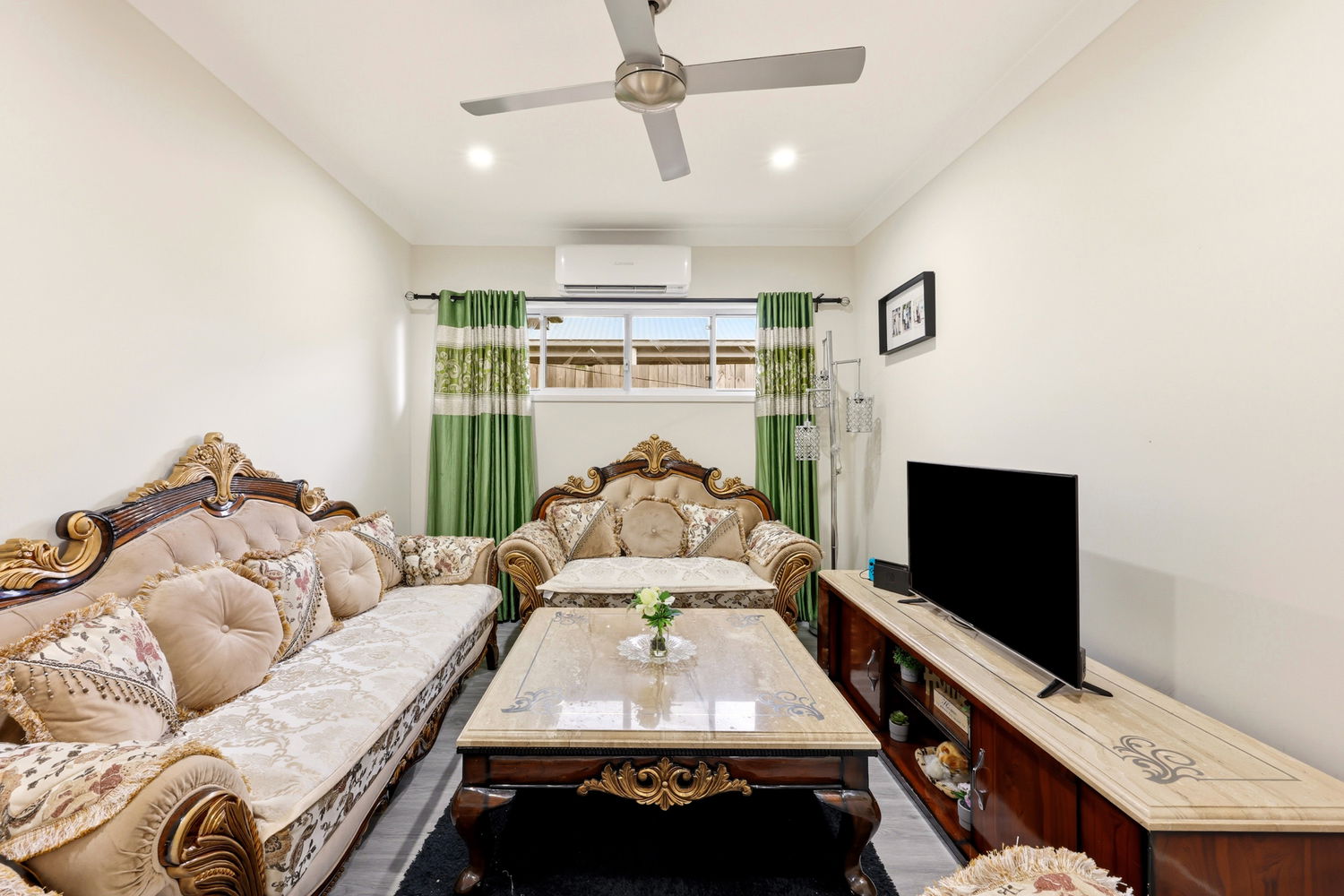 The spacious master suite offers a peaceful retreat, complete with a walk-in robe and private ensuite. Three additional bedrooms provide comfortable accommodation for the whole family, all thoughtfully designed with built-in robes and their own air-conditioning for year-round comfort.
