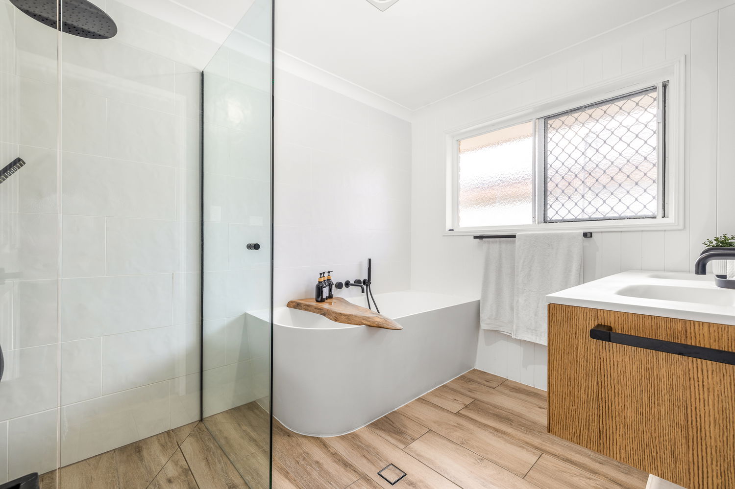 The main bathroom is stylishly renovated and includes a separate toilet, offering added convenience for busy families.