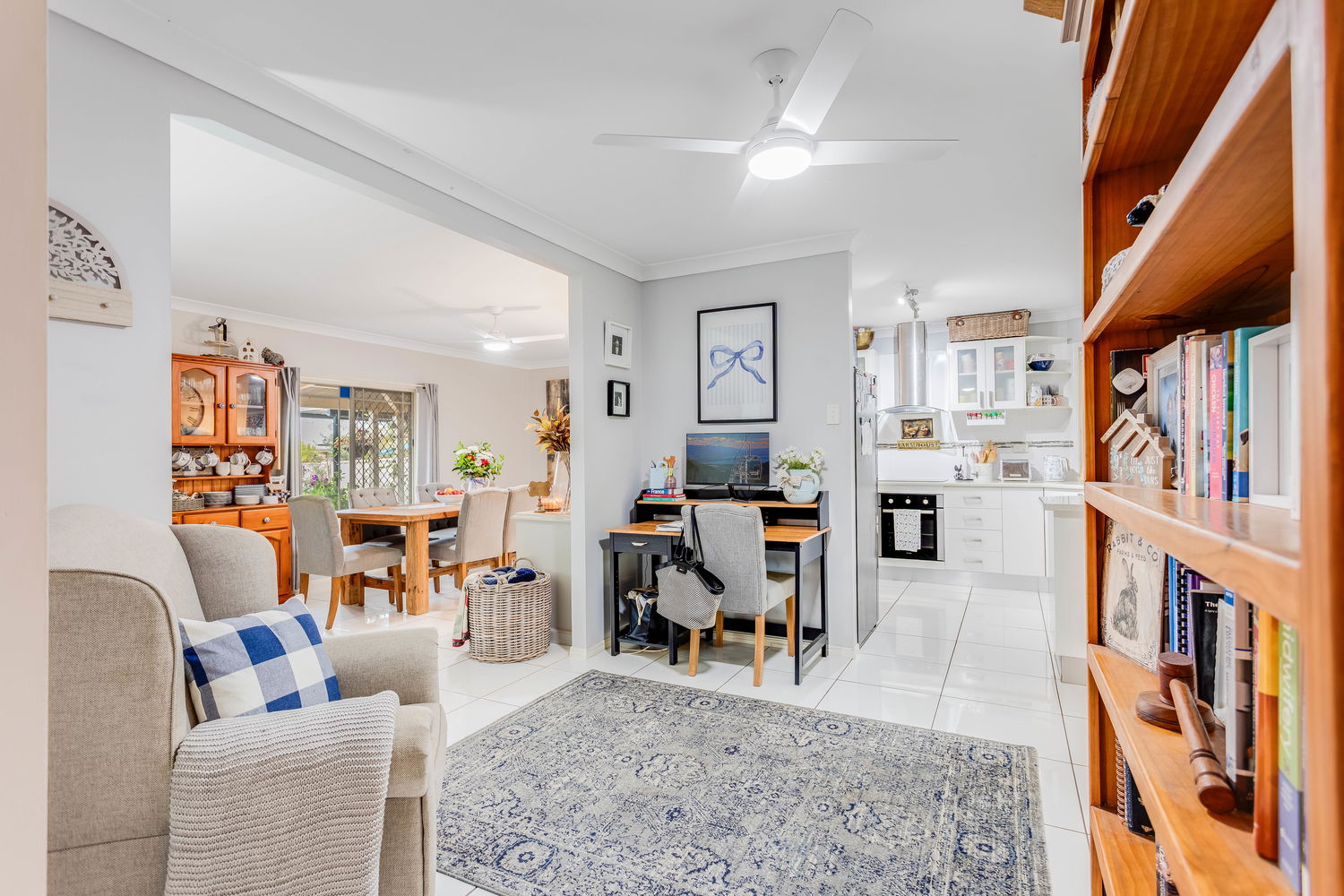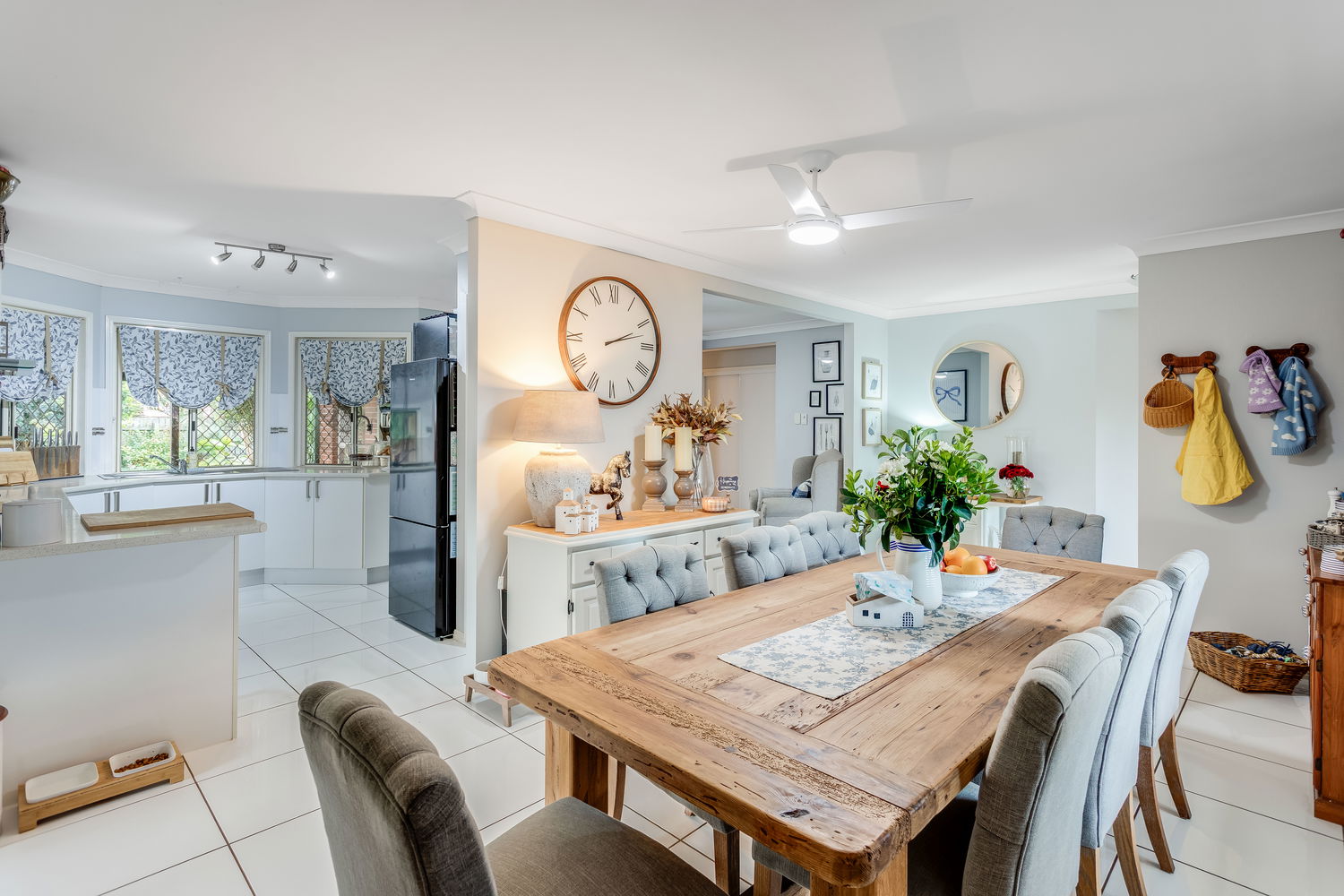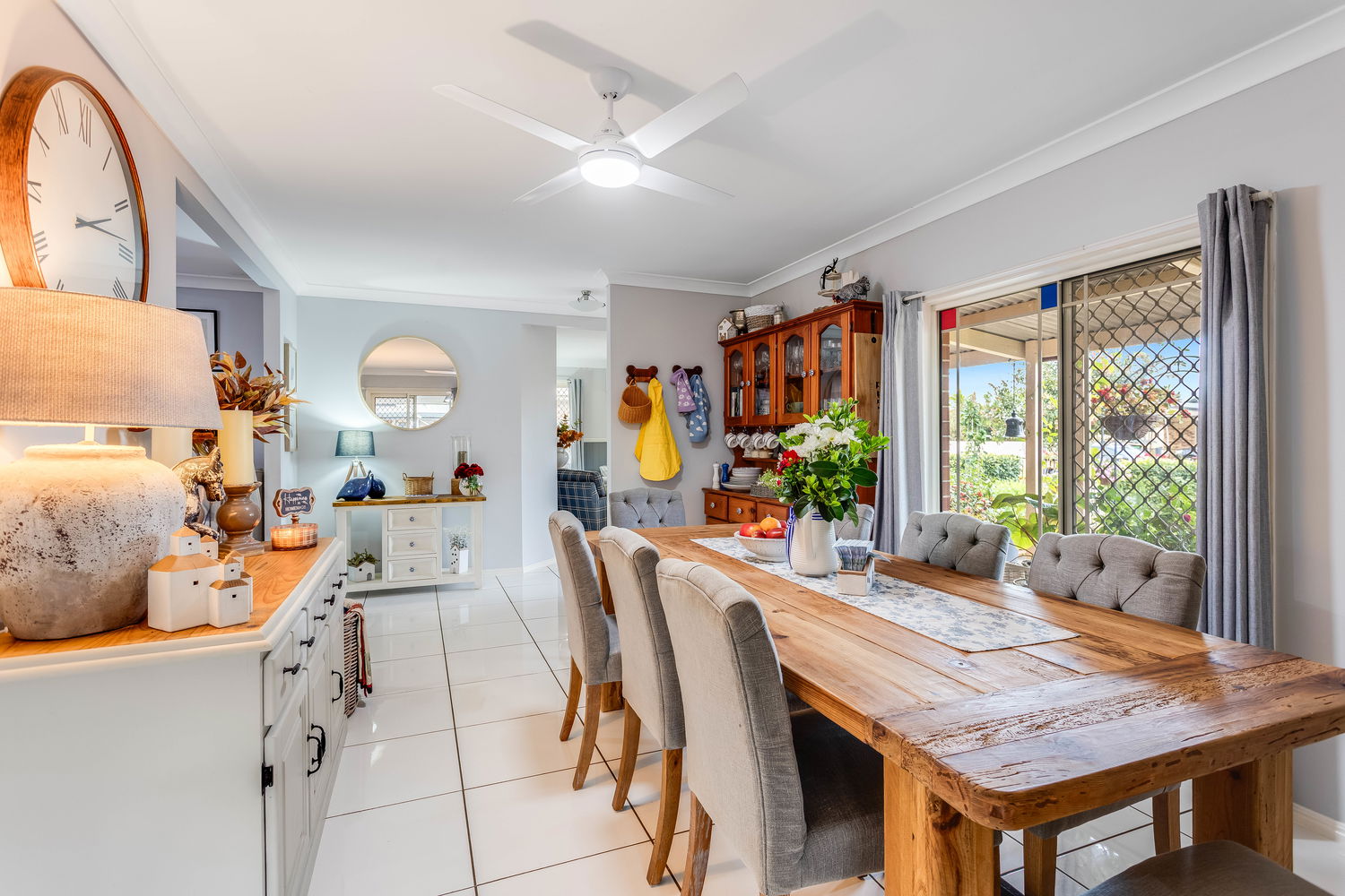Stepping inside, the home opens into a spacious living area bathed in natural light. The bay windows create an inviting atmosphere while framing garden views, making this space the perfect setting to relax with family or enjoy quiet evenings in comfort. The soft colour palette, air-conditioning, and ceiling fan ensure year-round comfort, while the homely design exudes warmth and style. Flowing through, the central dining area offers plenty of room for large gatherings, positioned right beside the kitchen so family and friends can stay connected whether they’re preparing meals or sharing stories at the table.