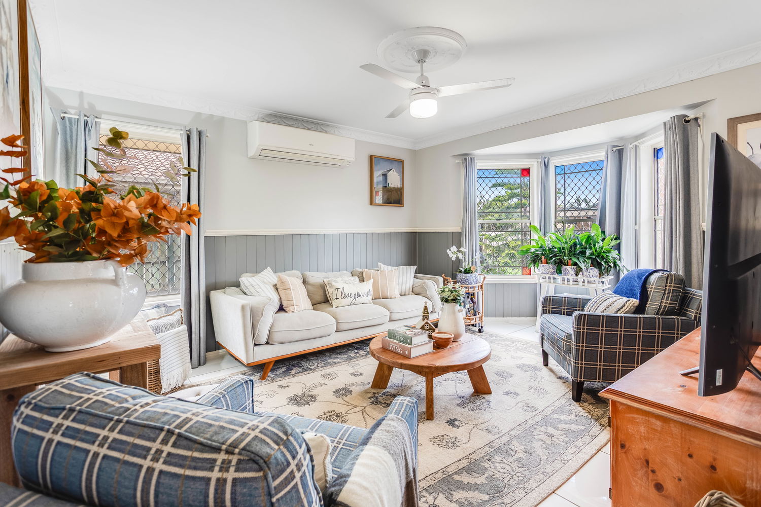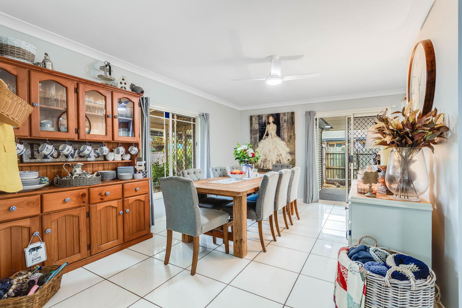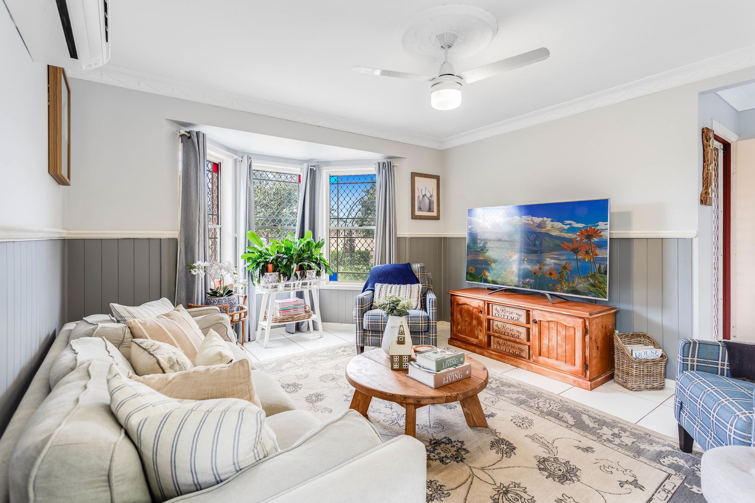 Stepping inside, the home opens into a spacious living area bathed in natural light. The bay windows create an inviting atmosphere while framing garden views, making this space the perfect setting to relax with family or enjoy quiet evenings in comfort. The soft colour palette, air-conditioning, and ceiling fan ensure year-round comfort, while the homely design exudes warmth and style. Flowing through, the central dining area offers plenty of room for large gatherings, positioned right beside the kitchen so family and friends can stay connected whether they’re preparing meals or sharing stories at the table.