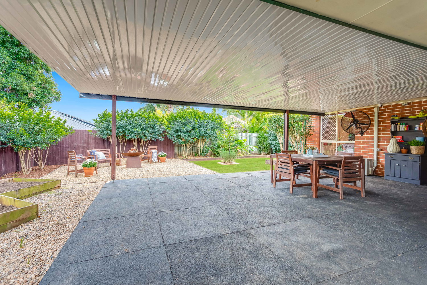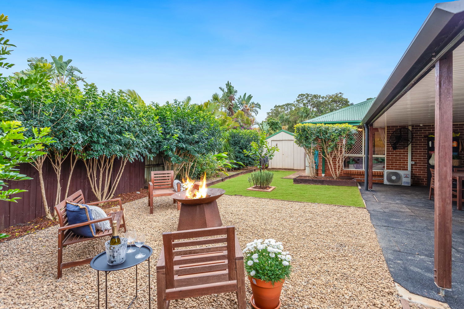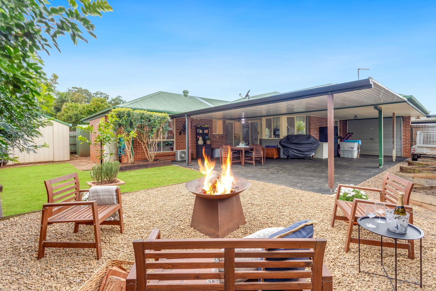 Outdoors, the property really shines. The expansive covered entertaining area is perfect for gatherings of any size – whether it’s hosting weekend barbecues, celebrating special occasions, or enjoying quiet family dinners in the fresh air. From here, the backyard extends into a beautifully landscaped retreat. A dedicated fire-pit zone surrounded by gravel and stylish timber seating makes evenings under the stars a delight, while lush lawns and easy-care gardens create plenty of space for pets or children to play. A large shed and garden shed offer excellent storage for tools, bikes, or hobbies, ensuring everything has its place.