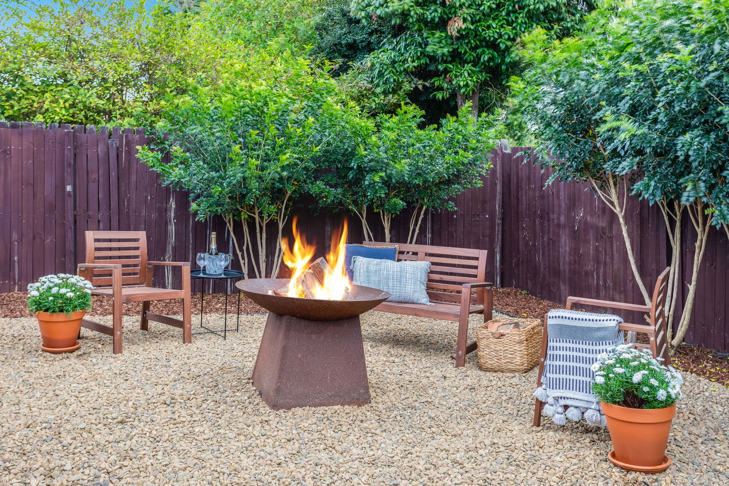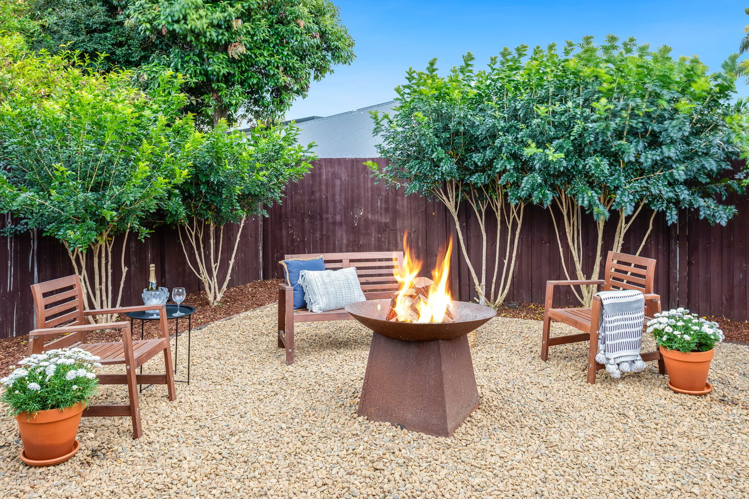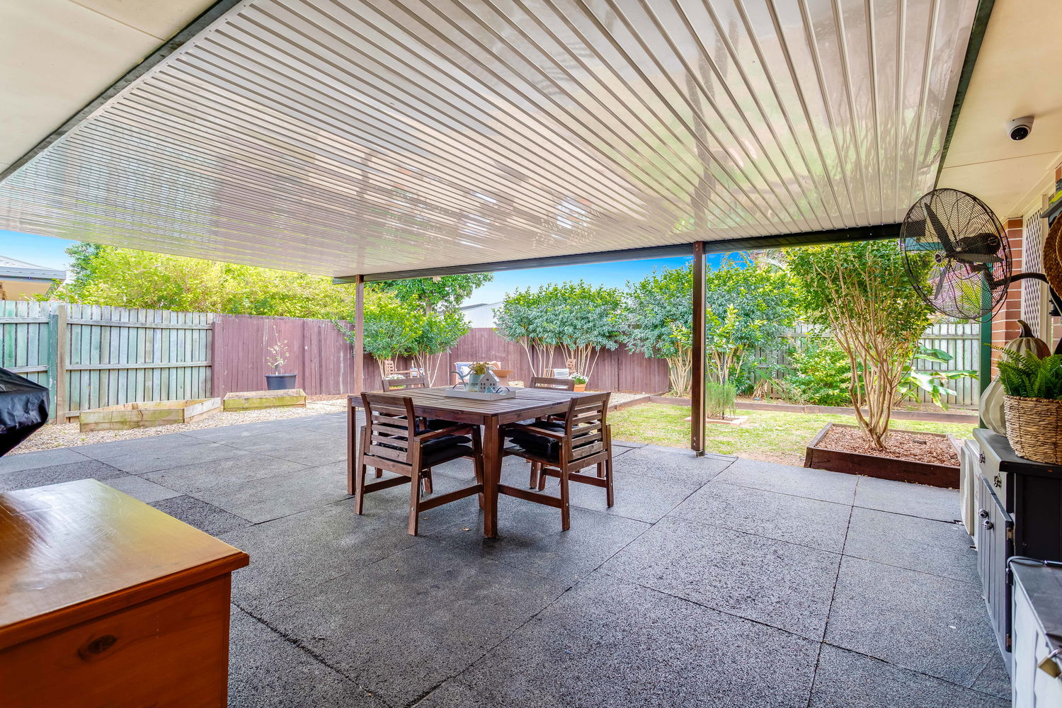 Outdoors, the property really shines. The expansive covered entertaining area is perfect for gatherings of any size – whether it’s hosting weekend barbecues, celebrating special occasions, or enjoying quiet family dinners in the fresh air. From here, the backyard extends into a beautifully landscaped retreat. A dedicated fire-pit zone surrounded by gravel and stylish timber seating makes evenings under the stars a delight, while lush lawns and easy-care gardens create plenty of space for pets or children to play. A large shed and garden shed offer excellent storage for tools, bikes, or hobbies, ensuring everything has its place.