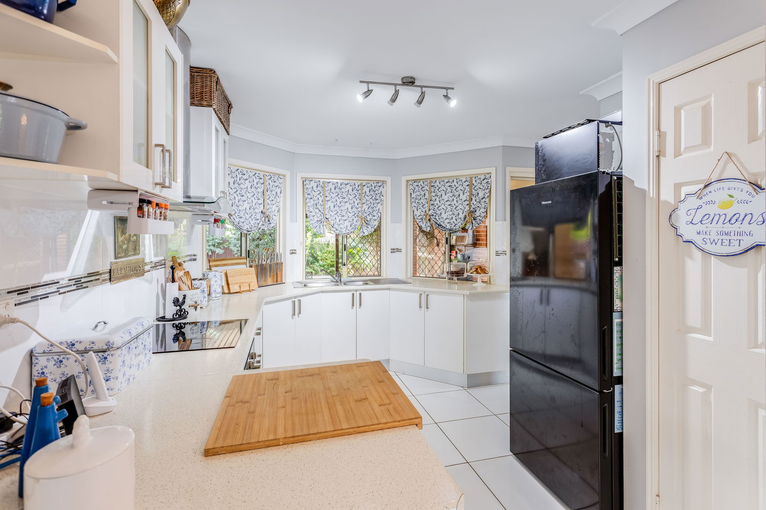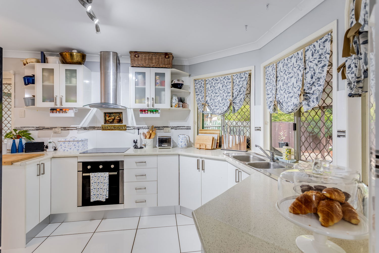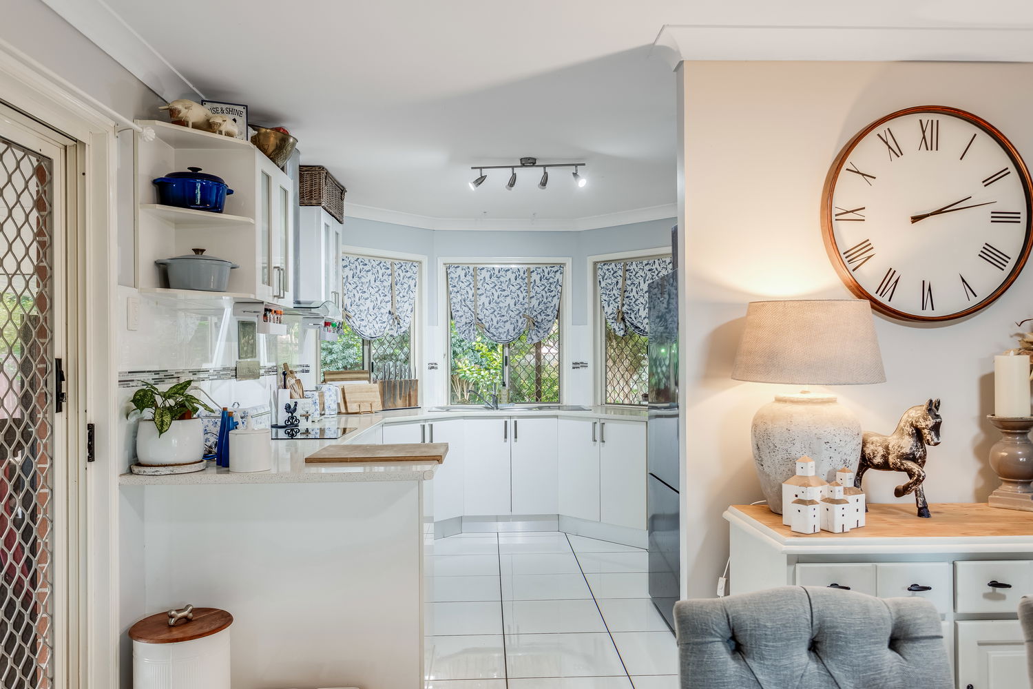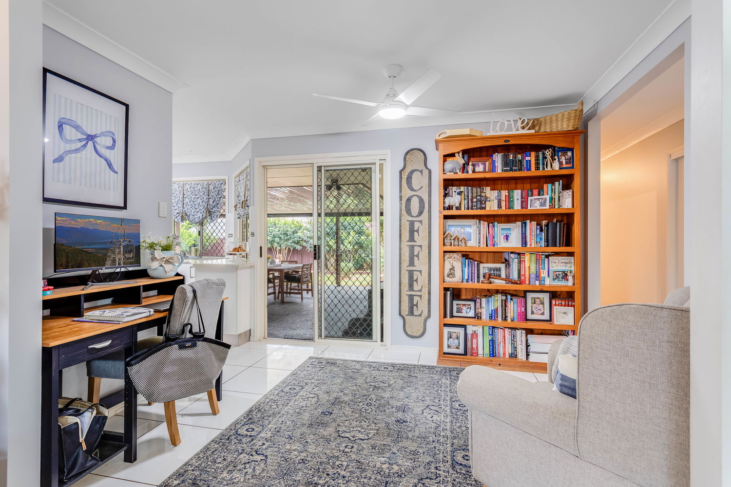 The kitchen is as practical as it is inviting, boasting ample cabinetry, plenty of bench space, and a bright outlook across the yard. The bay-style windows above the sink draw in natural light, making it a cheerful and functional hub of the home. Adjoining this space is a handy study nook that provides flexibility for working from home, a student desk, or an organised household command centre.