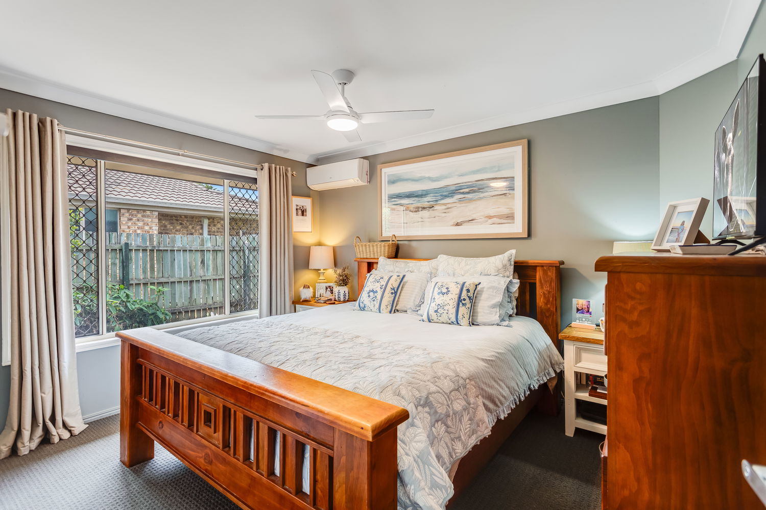 The property features four bedrooms, each with built-in wardrobes and ceiling fans. The master suite is positioned privately at the front of the home, offering air-conditioning and easy access to the ensuite bathroom. Bedrooms two, three, and four are well positioned around the family bathroom, creating a practical and family-friendly layout. With an additional bathroom, separate laundry, and thoughtful storage throughout, the home has been designed with day-to-day living in mind.