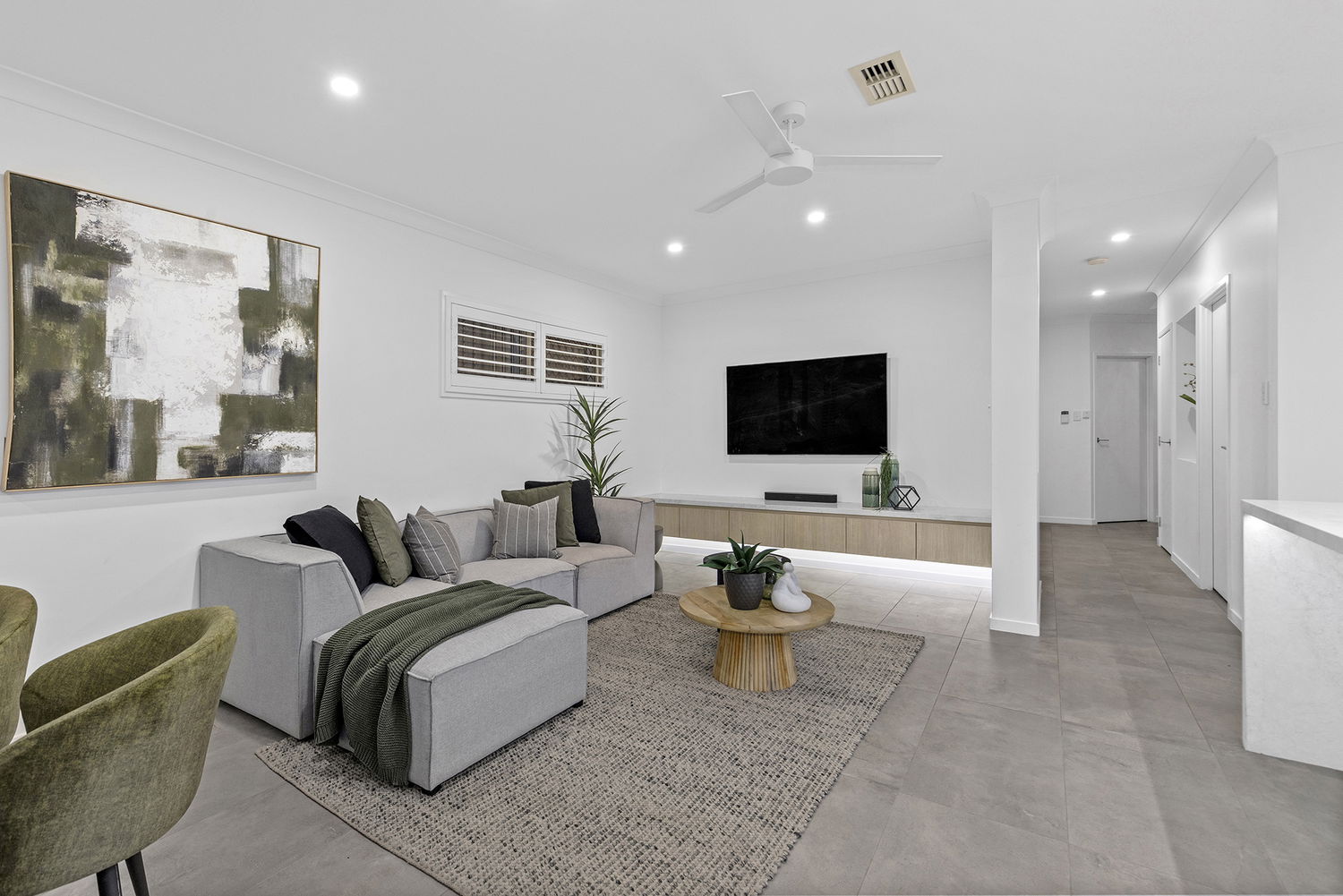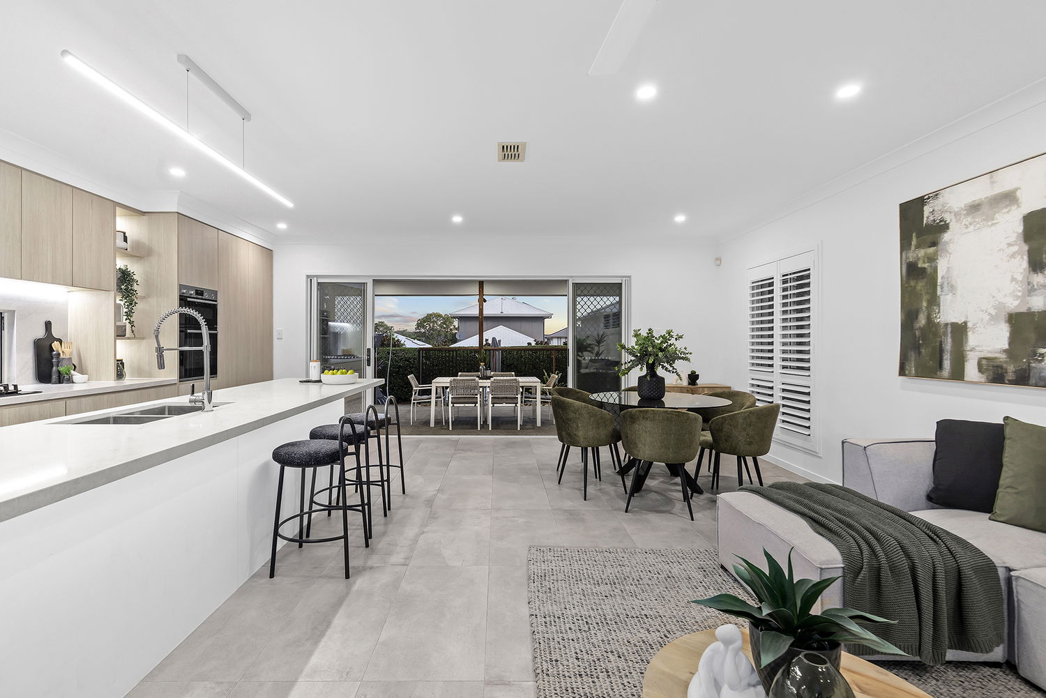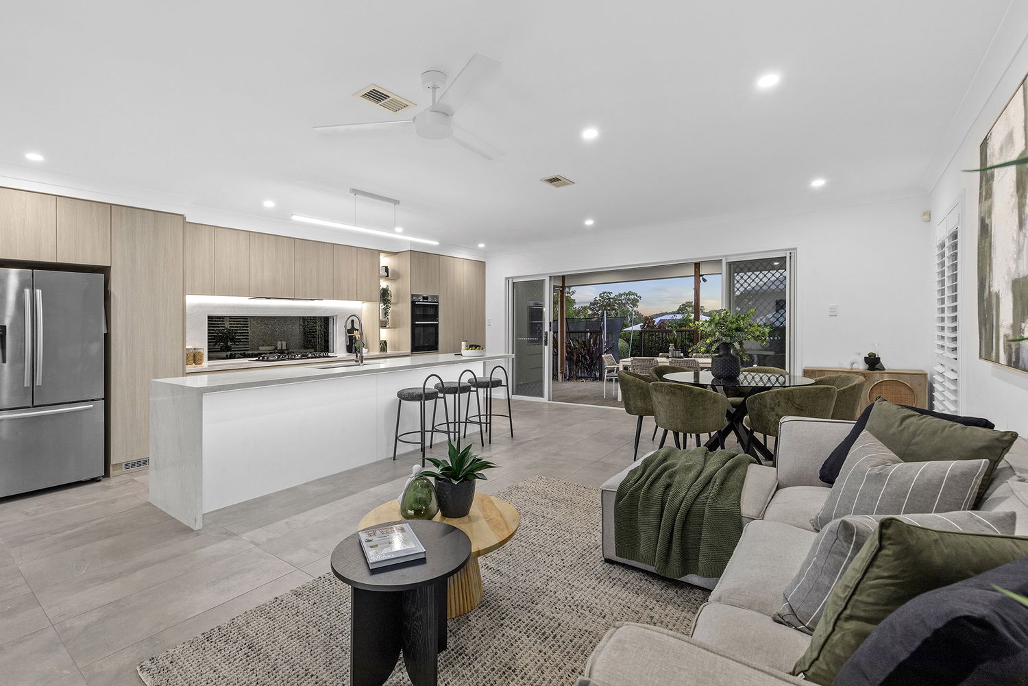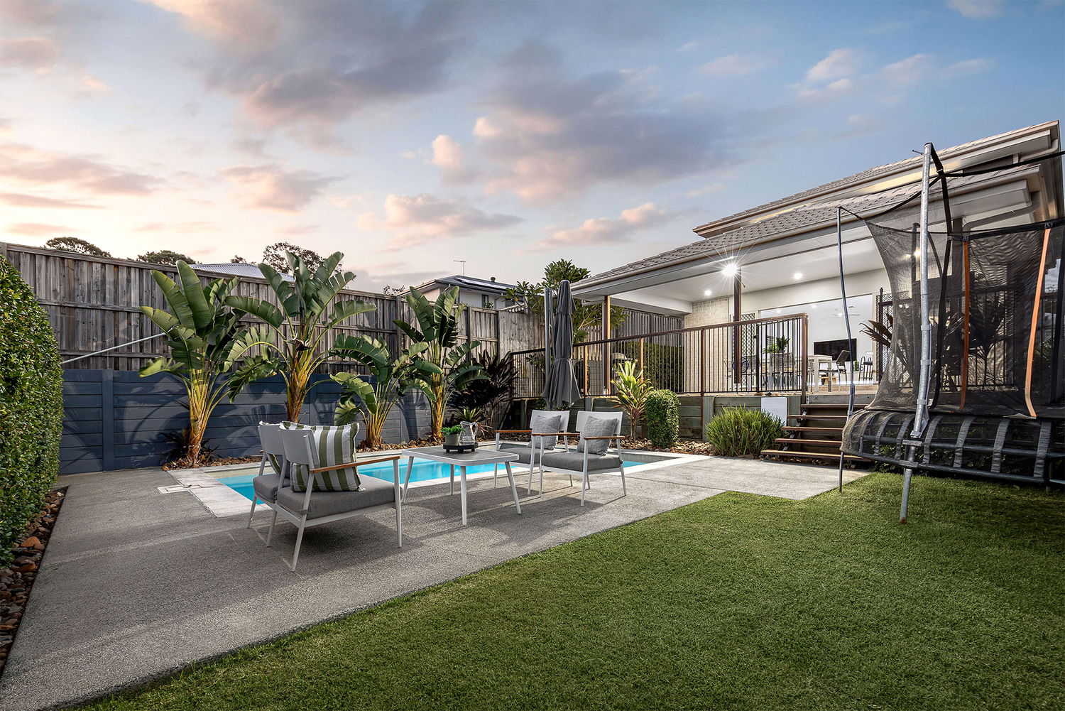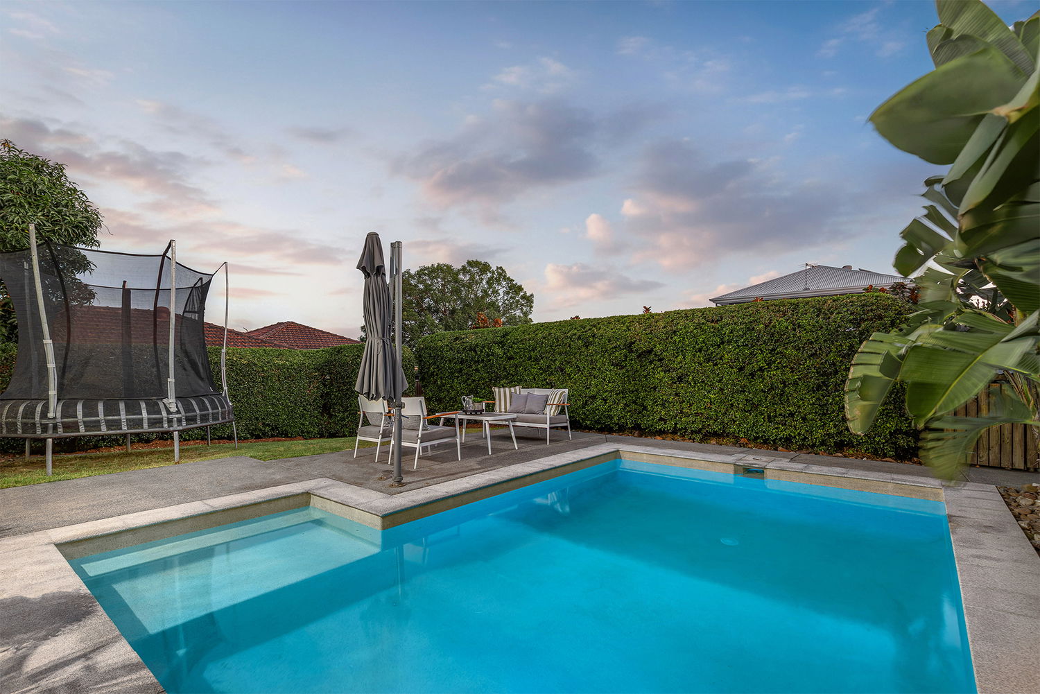 Sliding doors extend the living spaces to a generously covered alfresco area, ideal for year-round entertaining. Framed by lush tropical greenery, the outdoor zone feels like a private retreat and includes a sparkling in-ground saltwater chlorinated swimming pool.