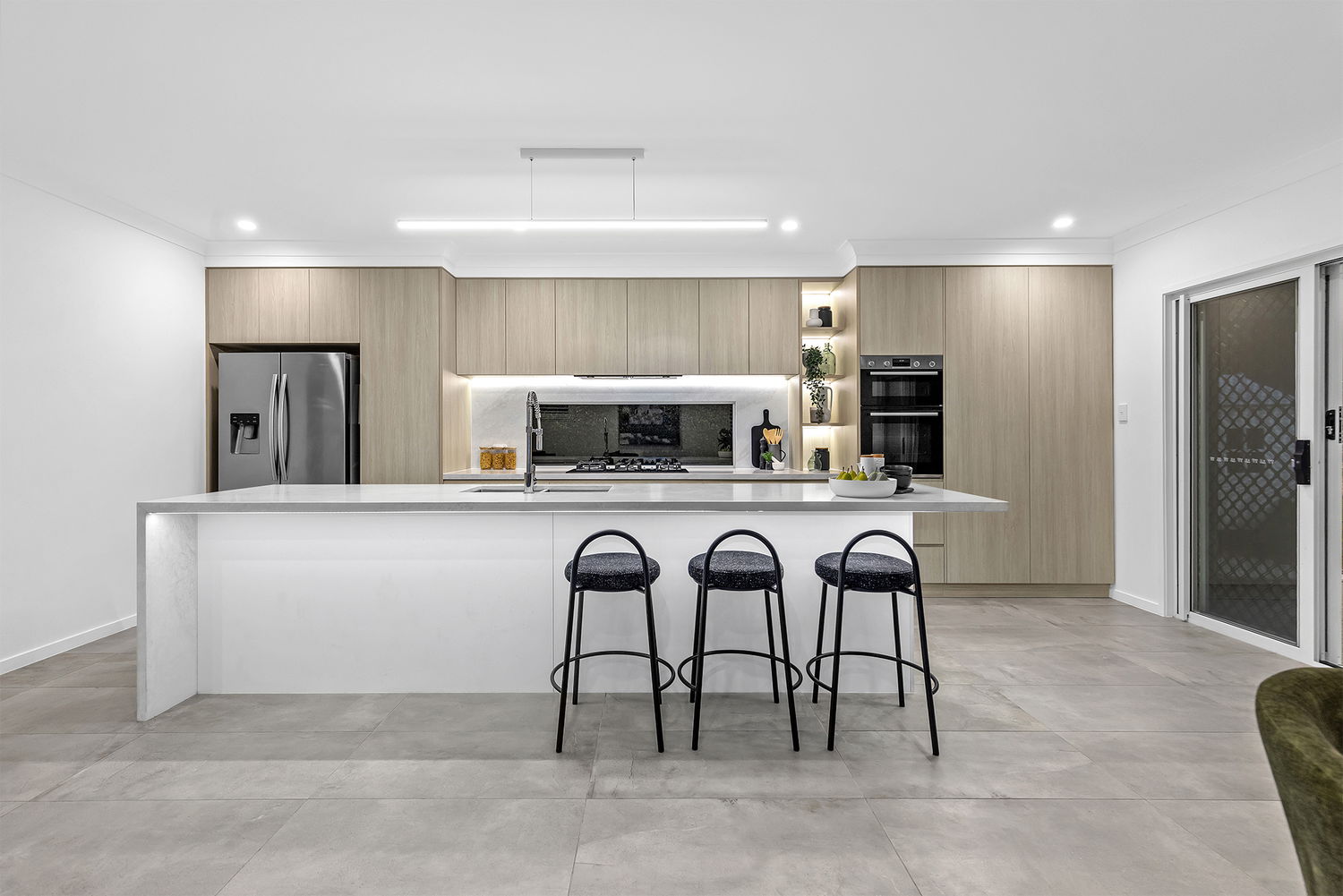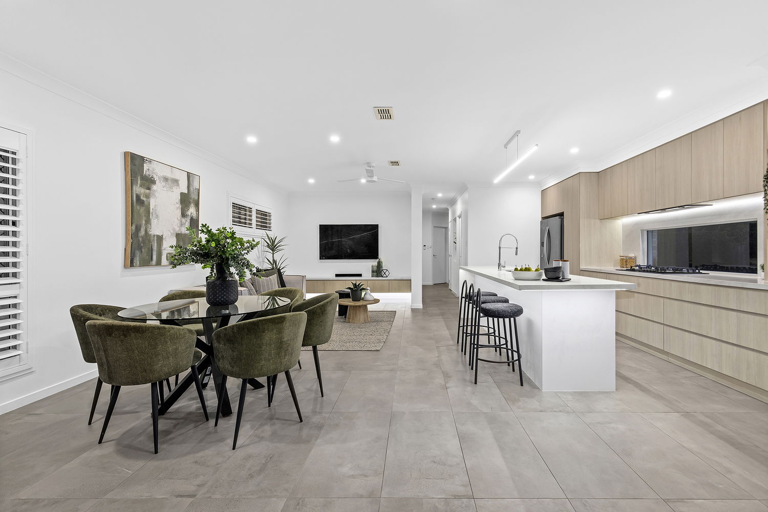 An impressive street presence sets the tone, opening to a well-considered interior enhanced by high ceilings on the lower level and stylish finishes throughout. The heart of the home is the open-plan living and dining area, anchored by a statement kitchen featuring quality cabinetry, a Bosch gas cooktop (bottled gas), Bosch oven with warming drawer, expansive stone benchtops, and a large island with pendant lighting. Designed for both everyday functionality and entertaining, the island also offers additional seating — perfect for casual meals or gathering with guests.