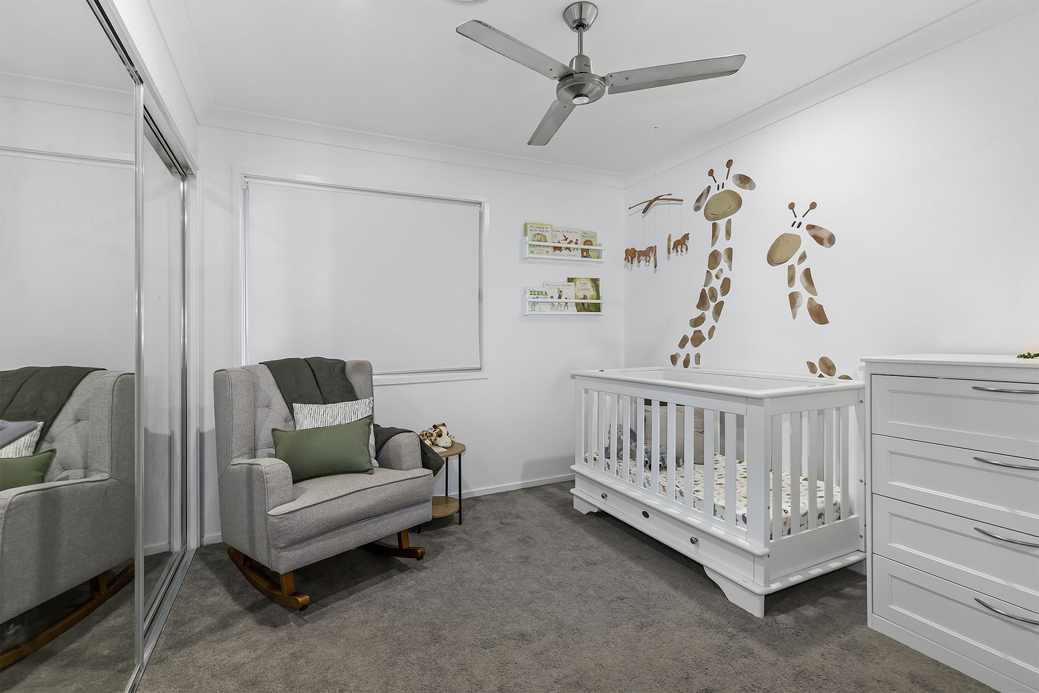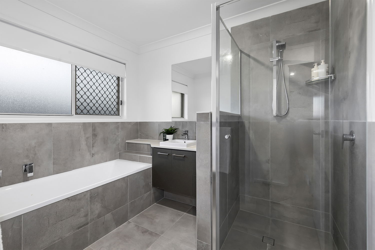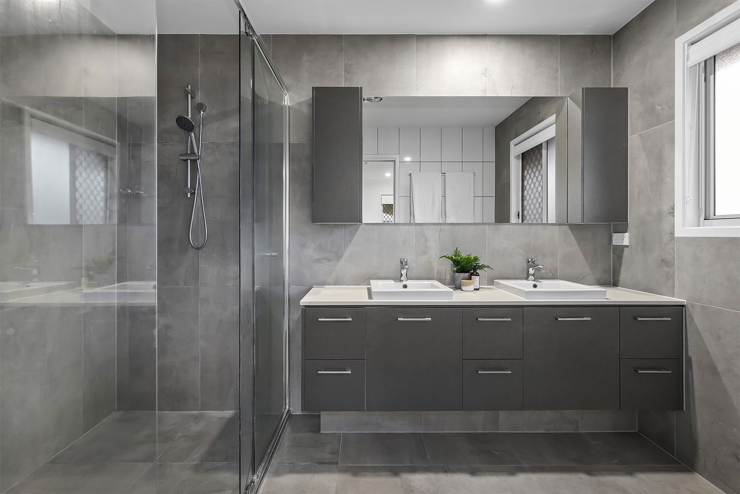 Upstairs, the master suite features a walk-in robe with ample drawer space and a spacious ensuite complete with dual vanities, twin basins, excellent storage, and an oversized shower spanning the length of the wall. Three additional bedrooms are generously proportioned, each with built-in mirrored wardrobes and ceiling fans.