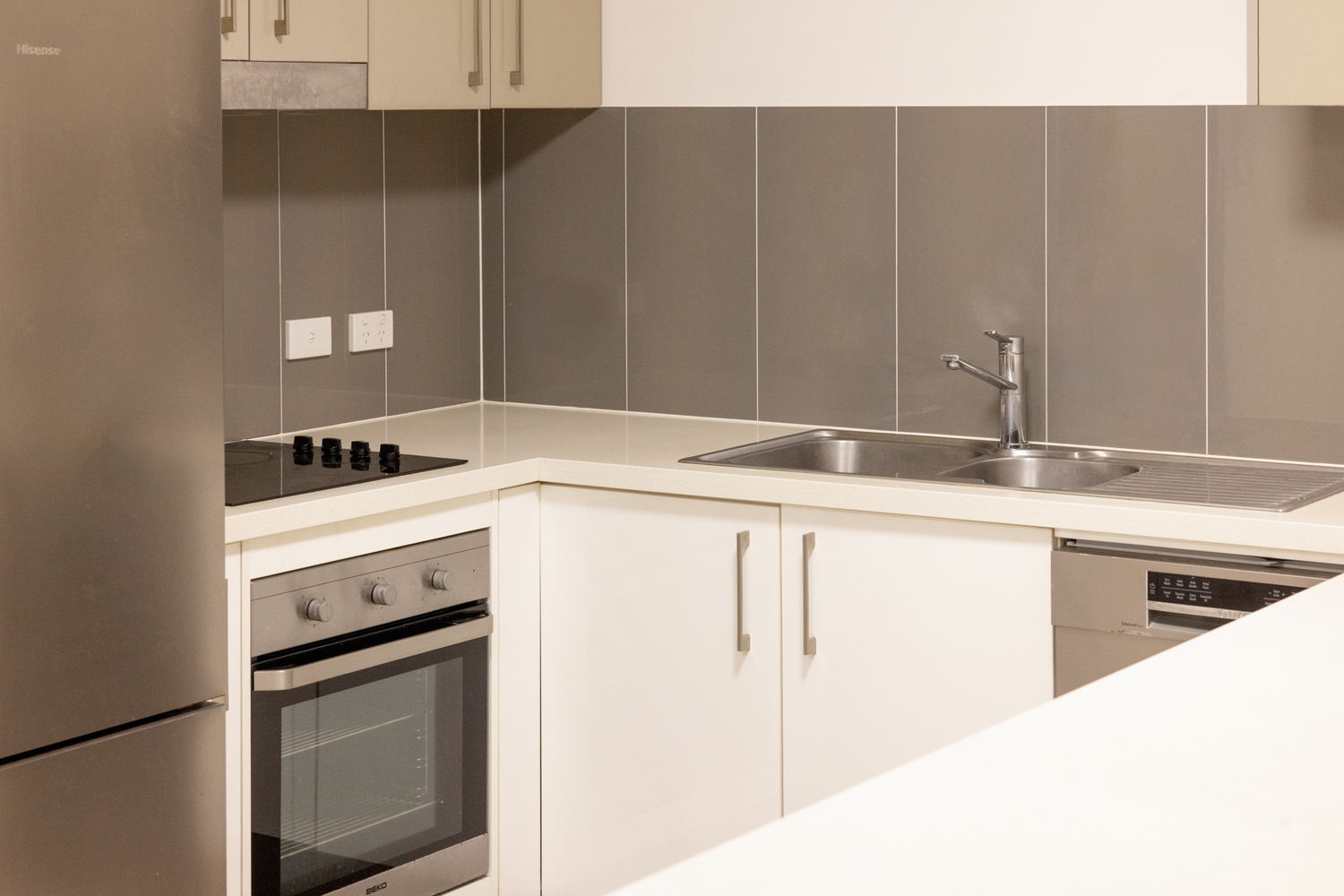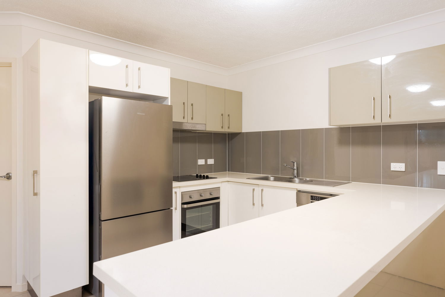 • Modern kitchen with stone benchtops and stainless-steel appliances