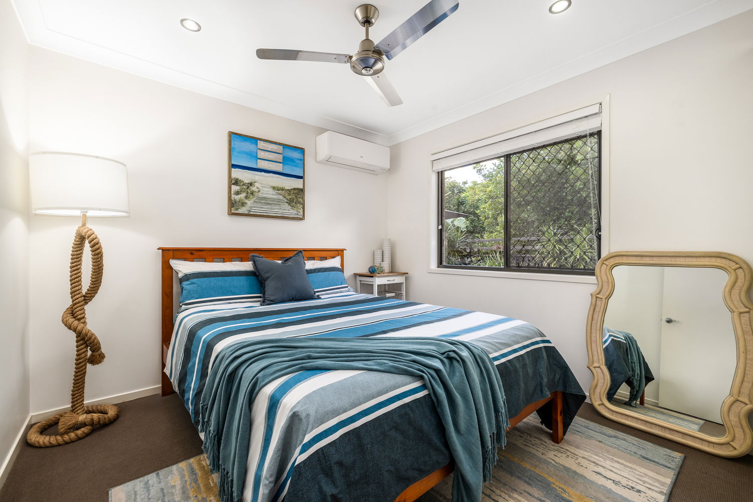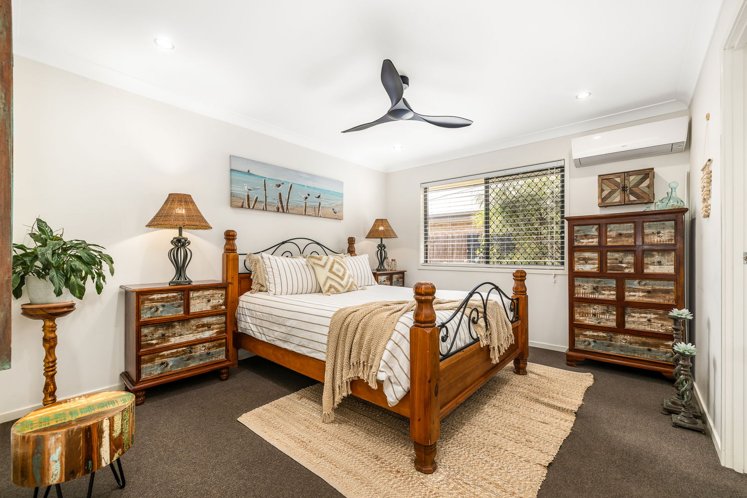 Spacious primary suite with air-conditioning, ceiling fan, walk-in robe, double vanity, new toilet suite and fresh carpet.