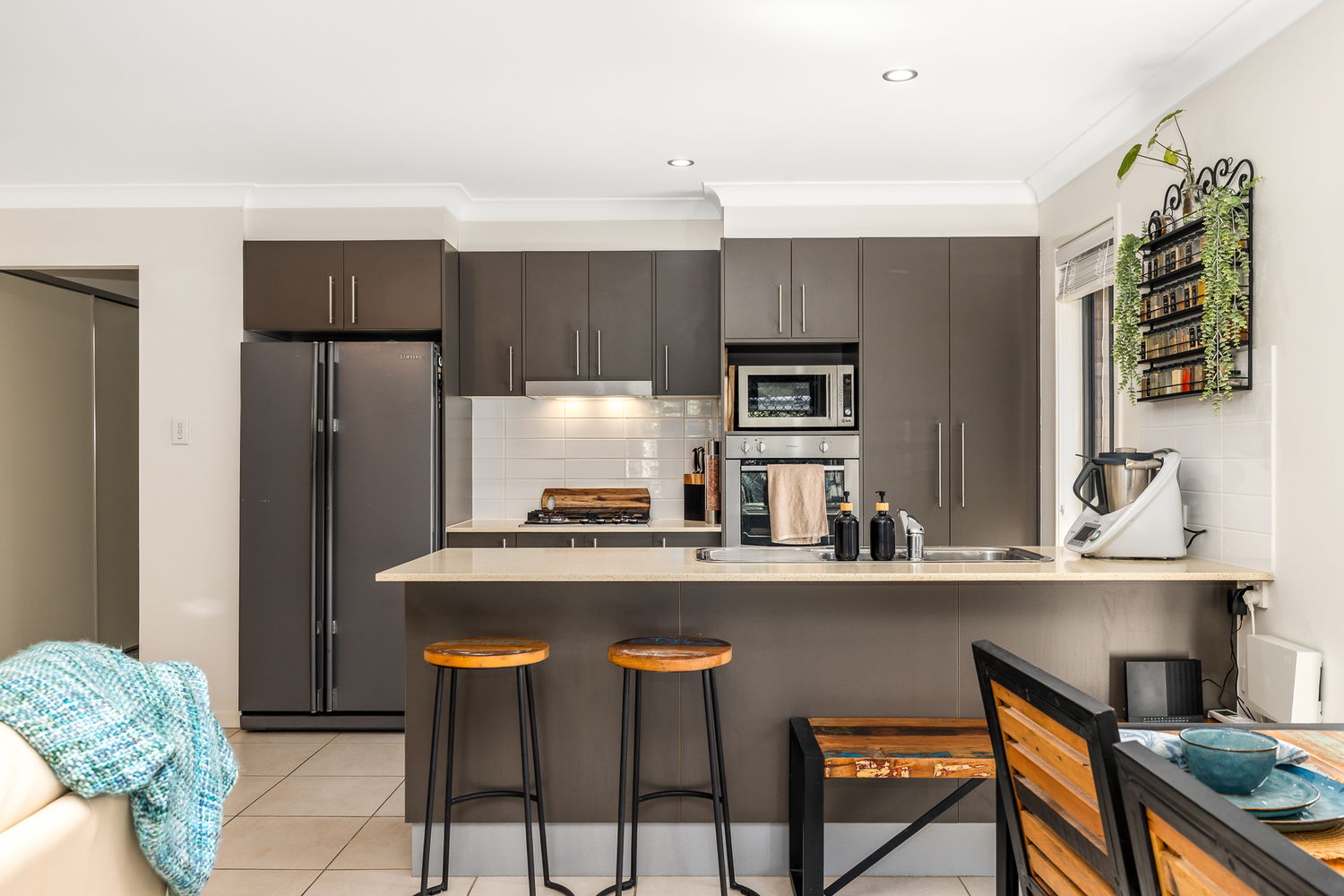 Modern galley kitchen with Caesarstone benchtops, gas cooktop, electric oven, dishwasher and large fridge cavity.