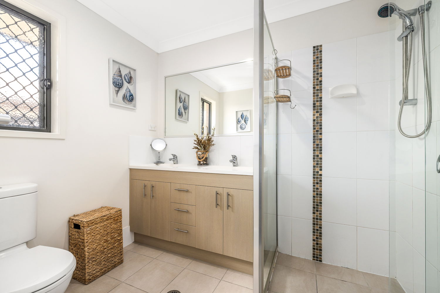 Main bathroom and ensuite in timeless neutral tones, with new shower poles—perfect for growing families.