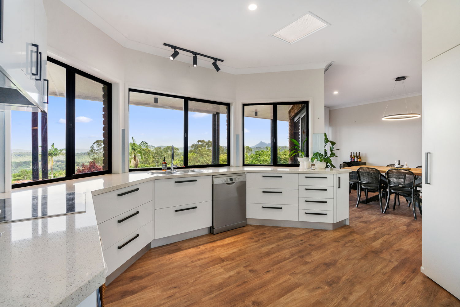 Stepping through the oversized front door, the scale of the home immediately reveals itself. High ceilings, new flooring, fresh paint and an abundance of natural light set the tone for the rest of the property. The main living area is a standout feature, with expansive panoramic windows perfectly framing uninterrupted hinterland and Mount Warning views. With no rooftops interrupting the outlook, the home feels open, peaceful and surrounded by nature.