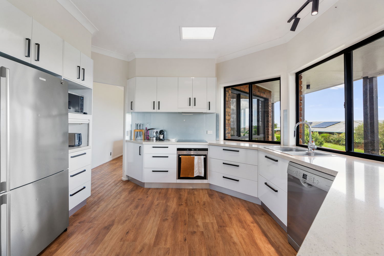 At the heart of the home sits the spacious and beautifully designed kitchen, perfectly positioned to capture the sweeping valley views through full-width bay windows. Featuring stone benchtops, a glass splashback, ceramic cooktop, stainless steel dishwasher, appliance station and natural skylights, the space is both functional and inviting. Flowing effortlessly into the dining and living areas, it creates a central hub ideal for everyday family living and effortless entertaining.