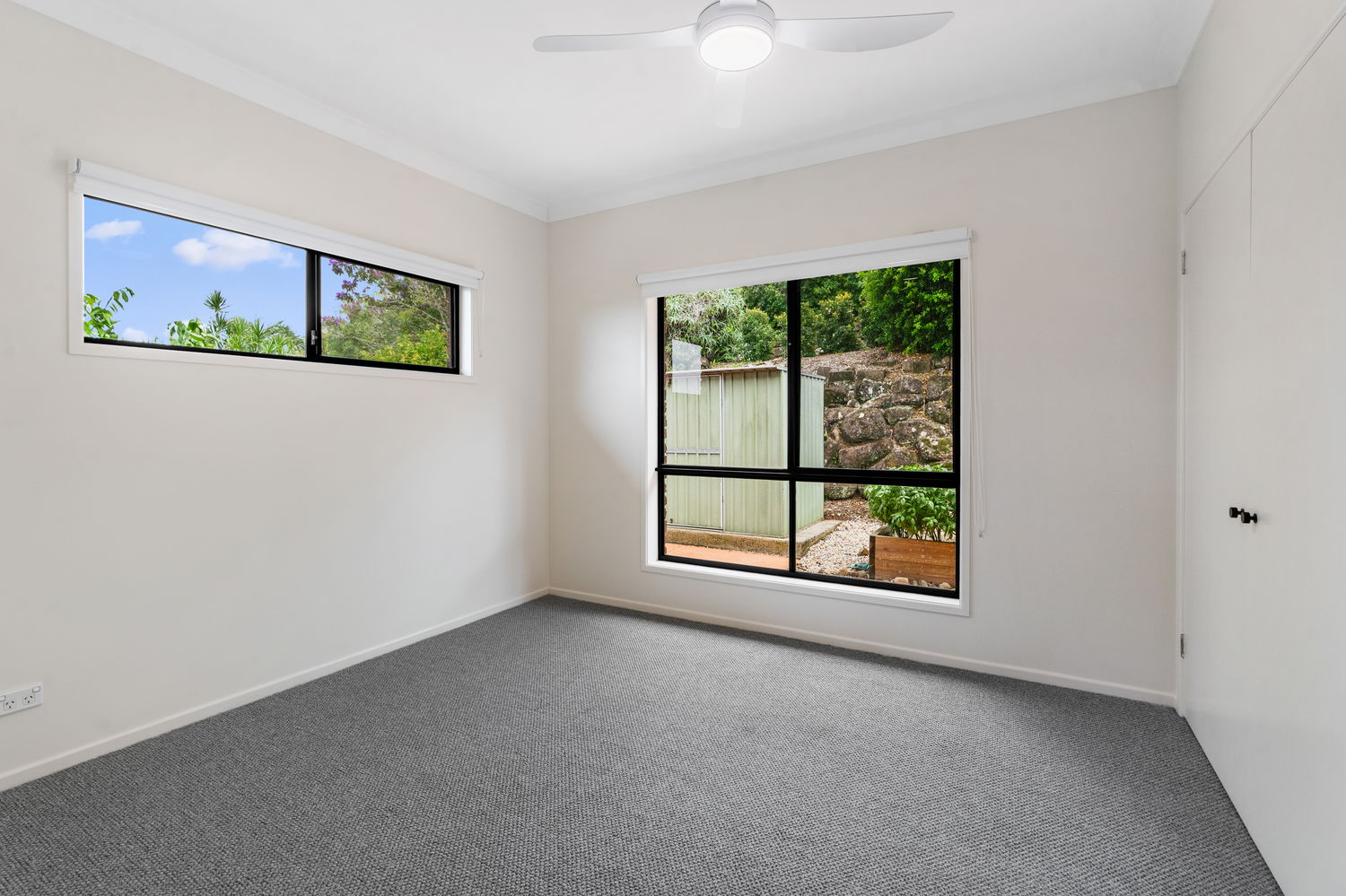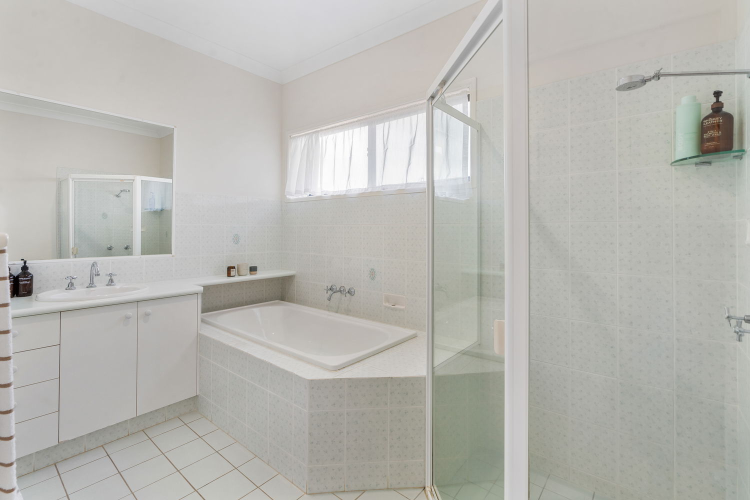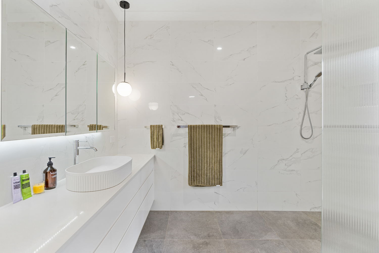 Privately positioned away from the other bedrooms, the oversized master suite offers a peaceful retreat. It includes a walk-in robe and a renovated ensuite featuring floor-to-ceiling tiles, frameless glass shower screen, full-width stone vanity, above-counter basin and discreet lighting. Large windows overlook established greenery and privacy hedges rather than neighbouring homes.