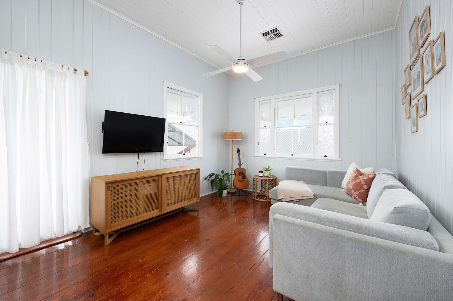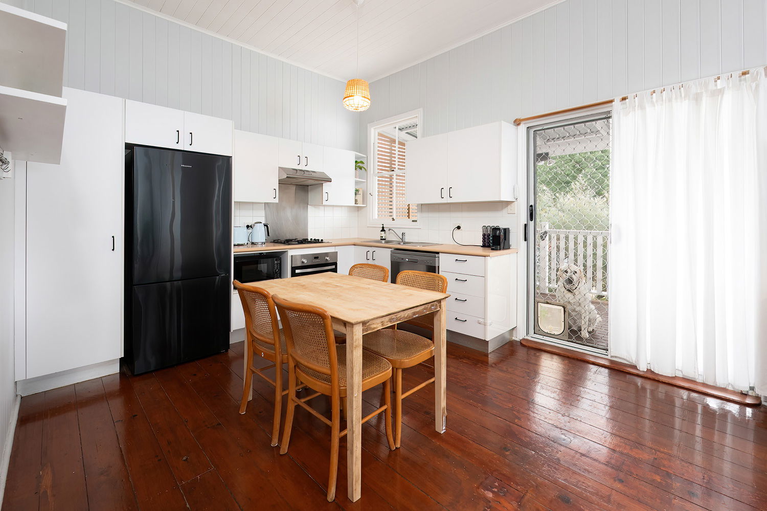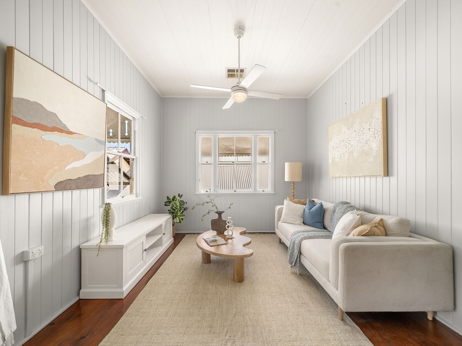 Step inside and be captivated by the open-plan main living area, where soaring high ceilings and classic VJ panelling beautifully showcase the home’s timeless character. Complete with refreshing ducted air-conditioning and ceiling fans to ensure year-round comfort, this inviting space is bathed in natural light, enhancing the warmth of the timber floors and creating a welcoming atmosphere from the moment you enter.