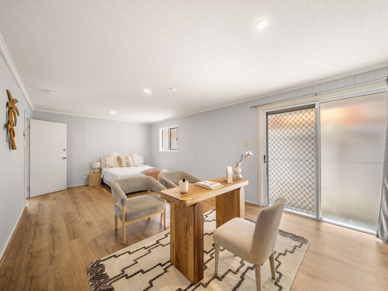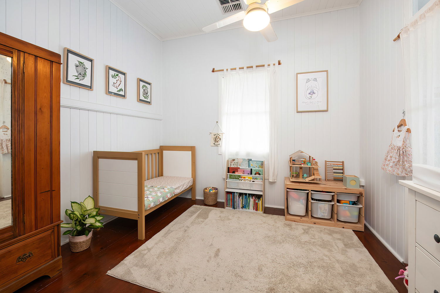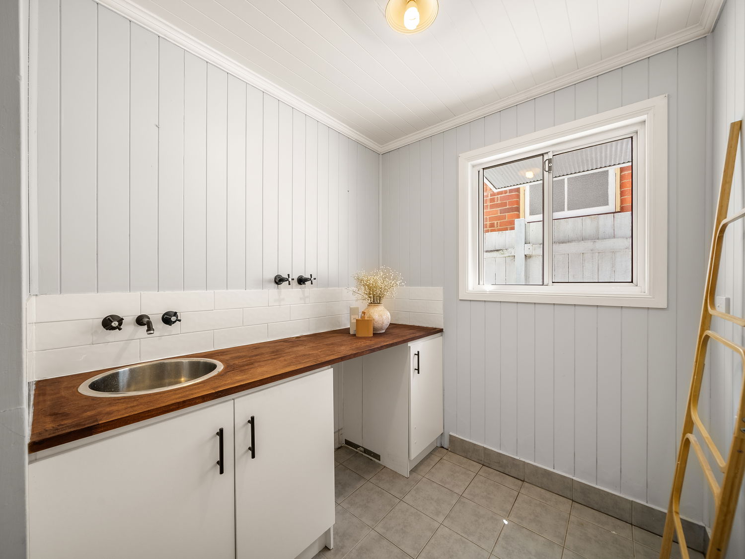 Step inside and be captivated by the open-plan main living area, where soaring high ceilings and classic VJ panelling beautifully showcase the home’s timeless character. Complete with refreshing ducted air-conditioning and ceiling fans to ensure year-round comfort, this inviting space is bathed in natural light, enhancing the warmth of the timber floors and creating a welcoming atmosphere from the moment you enter.