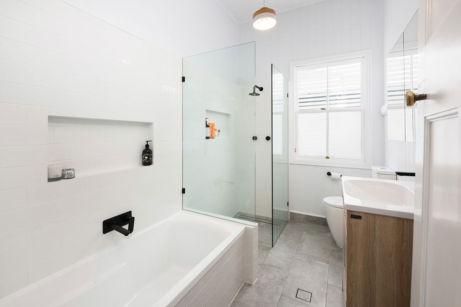 – Renovated bathroom with separate bath and shower